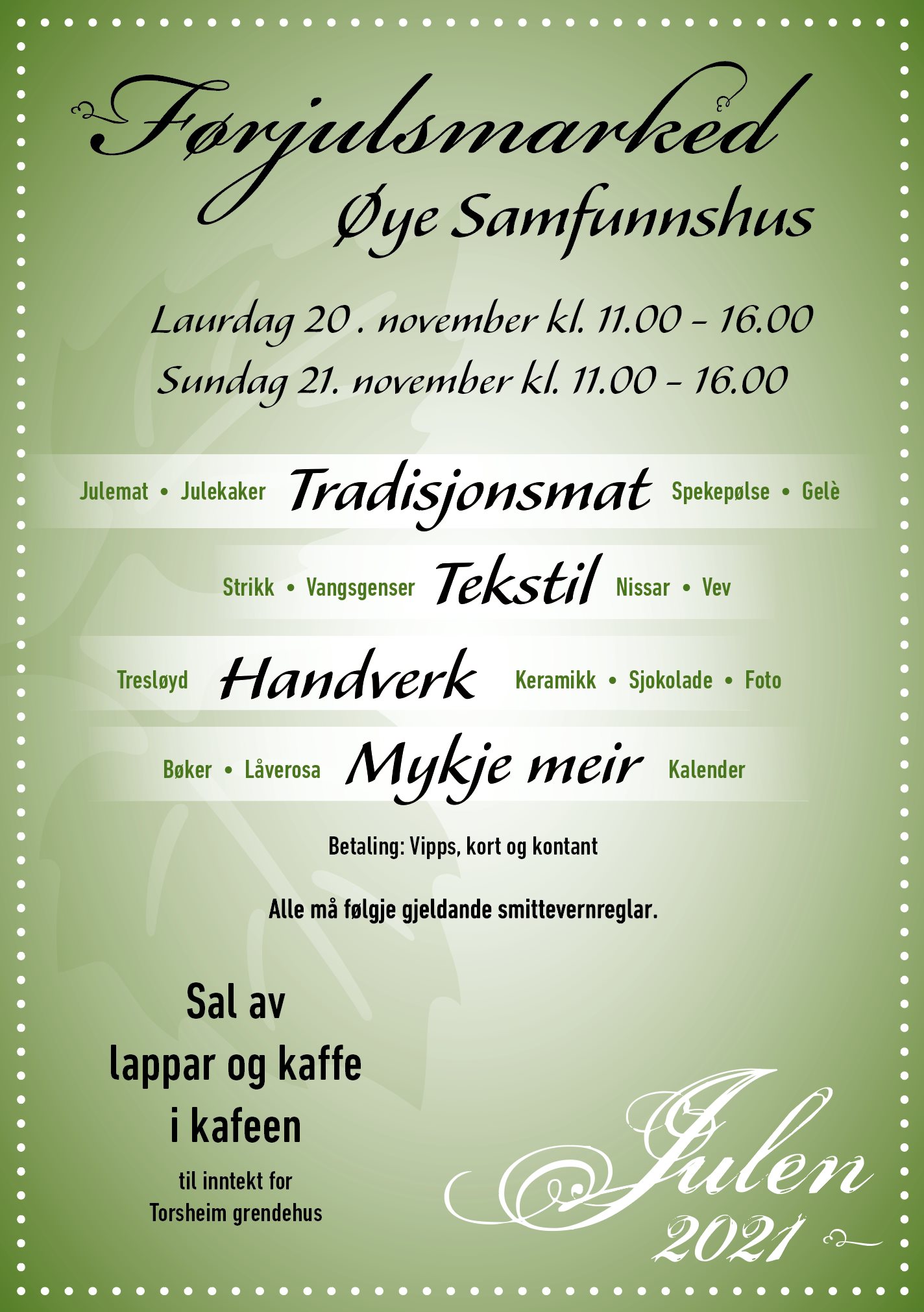 Og når du vert sliten og trøytt av ¨jolesjåppinga¨, sørger Torsheim grendehus for at du får deg både kaffe og lapper!
