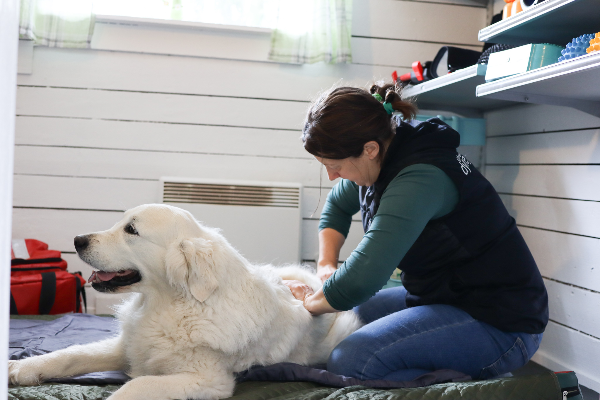 Eit viktig prinsipp for Anja er at all form for behandling skjer på bakkenivå, i motsetning til eit veterinærbesøk, der hundene gjerne må opp på benken.