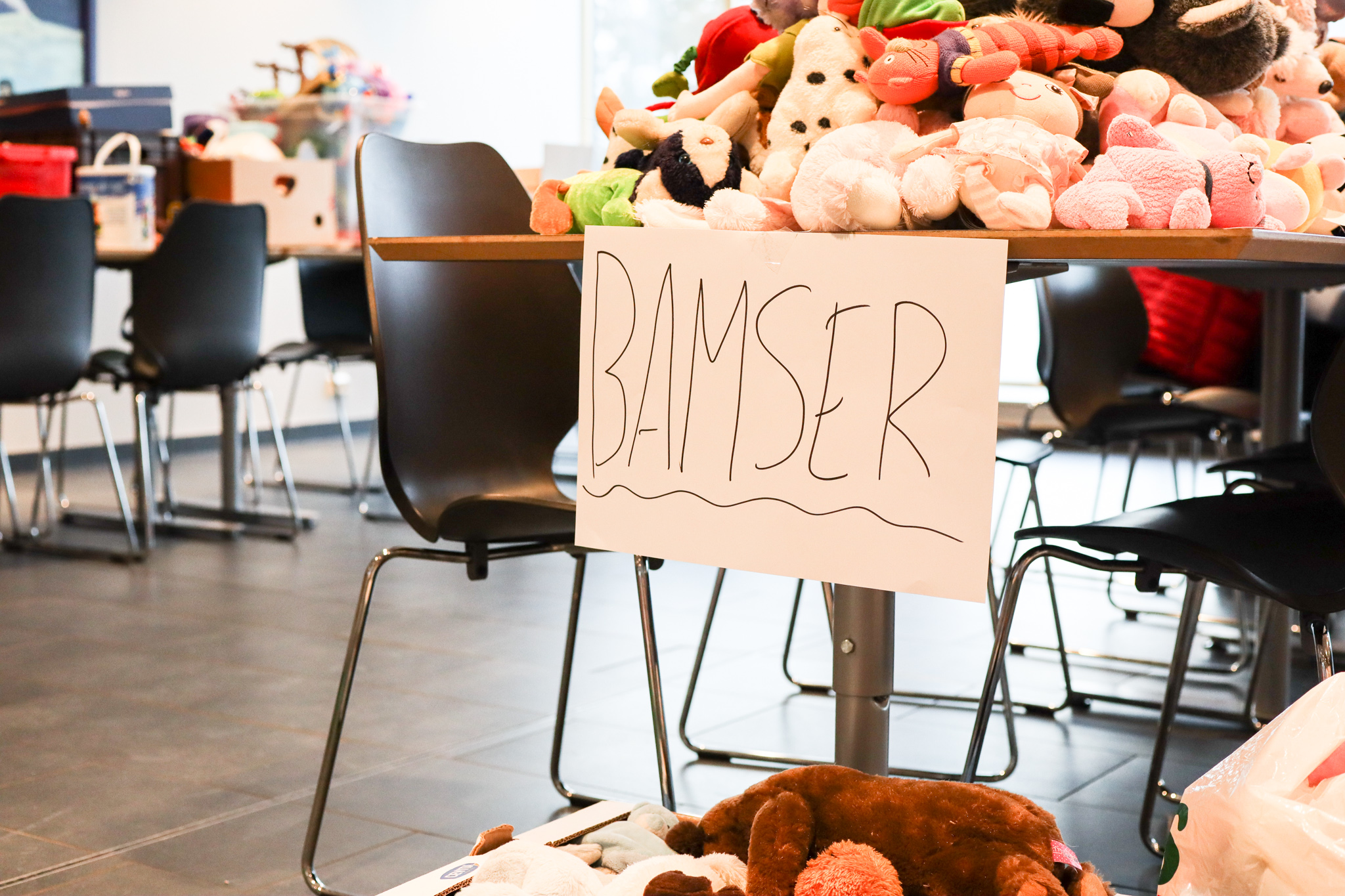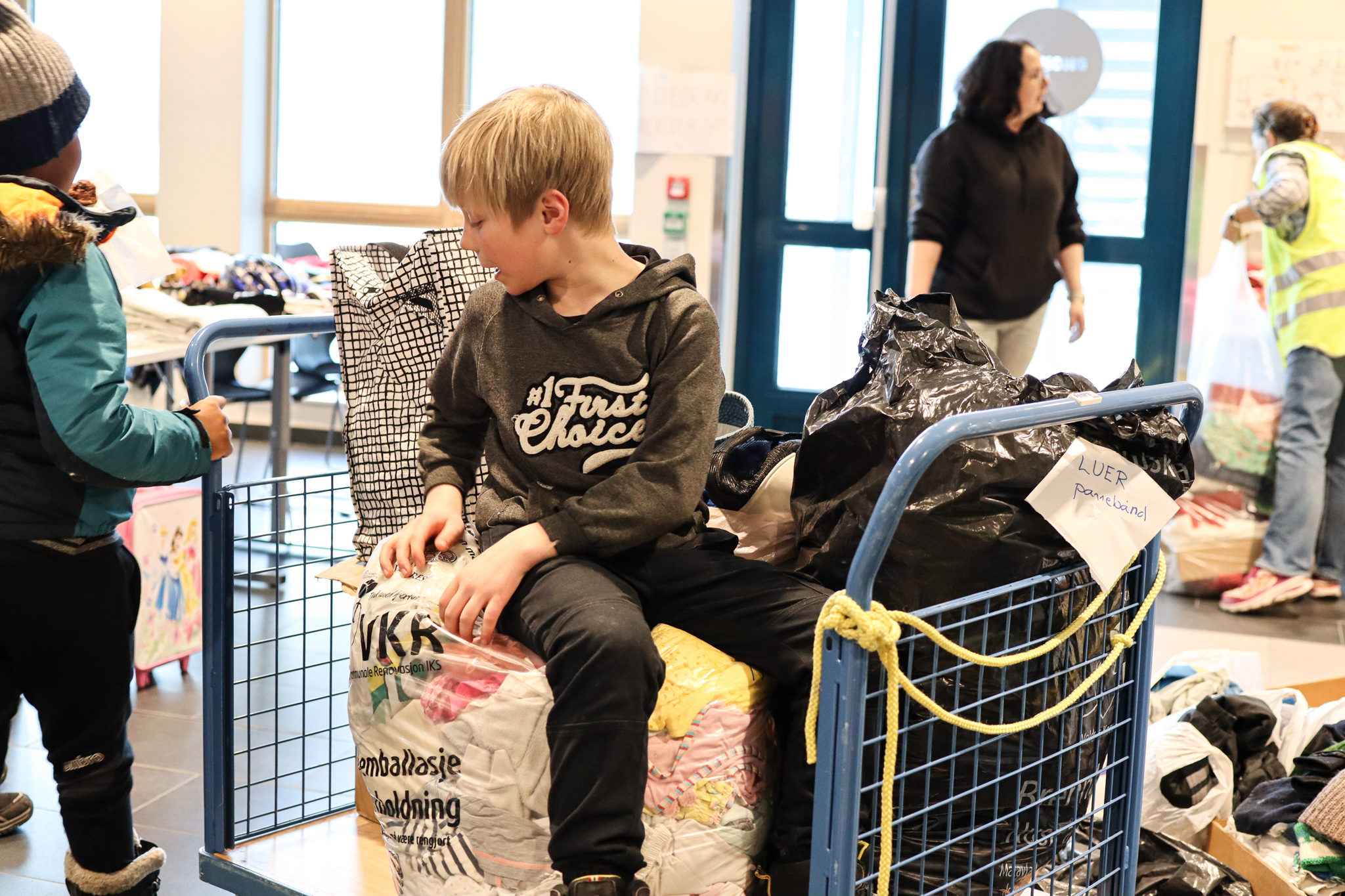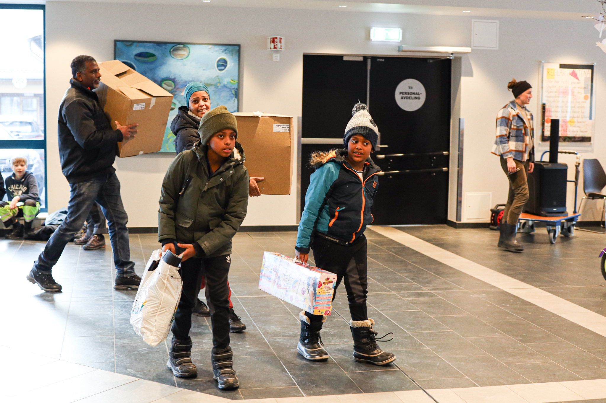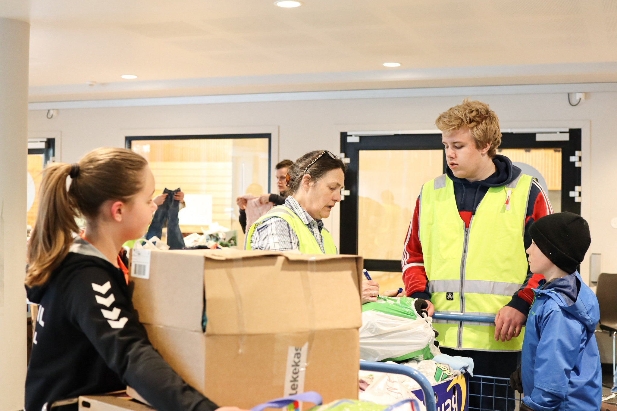 Inngangsdøra stod knapt stille denne ettermiddagen. Pose på pose med kleder fylte seg opp, leiker og utstyr rulla inn på bordene i foajeen på skulen. Eit heilt storstilt apparat vart sett i sving for å brette, sortere og pakke alt i ulike kategoriar og størrelser. Bamser, dukker, spel og trehjulssykler i lange baner. Hjelpande hender i alle kriker og kroker, blide fjes og høgt arbeidstempo.
