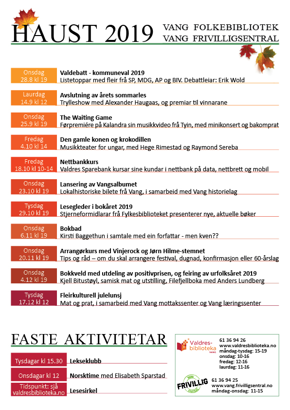 – Ellers held Elisabeth Sparstad held fram med sine norsktimar kvar onsdag, og i siste liten har vi fått på plass nok leksehjelper til å fortsette med lekseklubben. Lesesirkelen held også fram – her er det plass for både nye og gamle lesarar. Velkomen til ein spanande haust på biblioteket og frivilligsentralen i Vang, avsluttar Tangen.