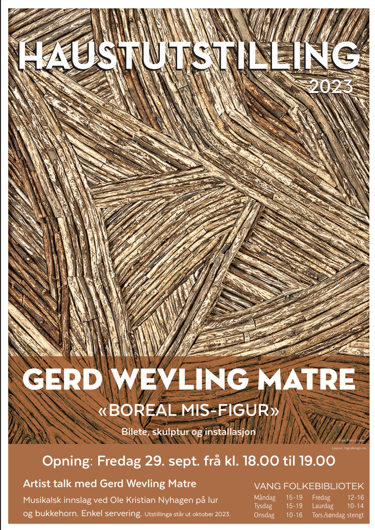 Kunstutvalet ynskjer velkomen til haustutstilling med Gerd Wevling Matre. Ho jobbar mykje med tre, både skulpturar, installasjonar og bilete. Ho har ei sterk tilknytning til natur og dyr, og det er nettopp samspelet mellom menneske, natur og dyr som står i fokus i kunsten hennar. «Det er noe med spor av levd liv som jeg er opptatt av, og alt man pådrar seg underveis. Fysisk og psykisk. I mennesker, i naturen, i virke, uansett hvor jeg går. Det er en del av vår kulturhistorie.»