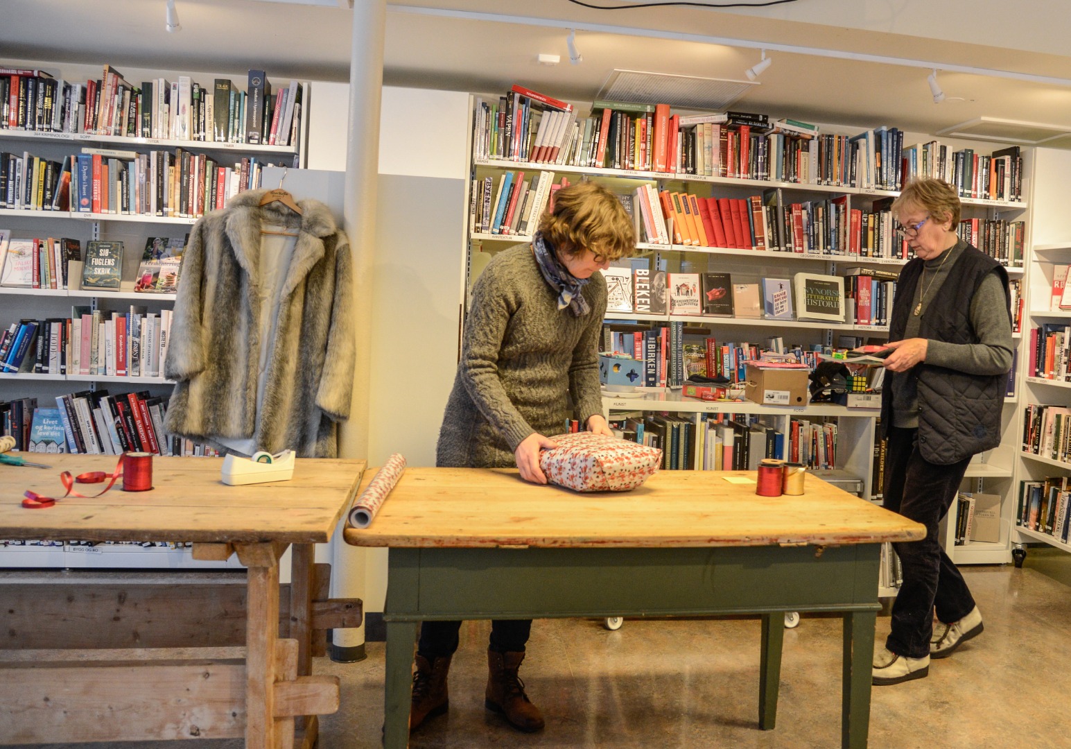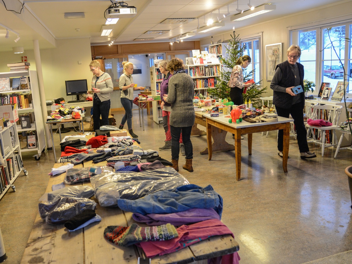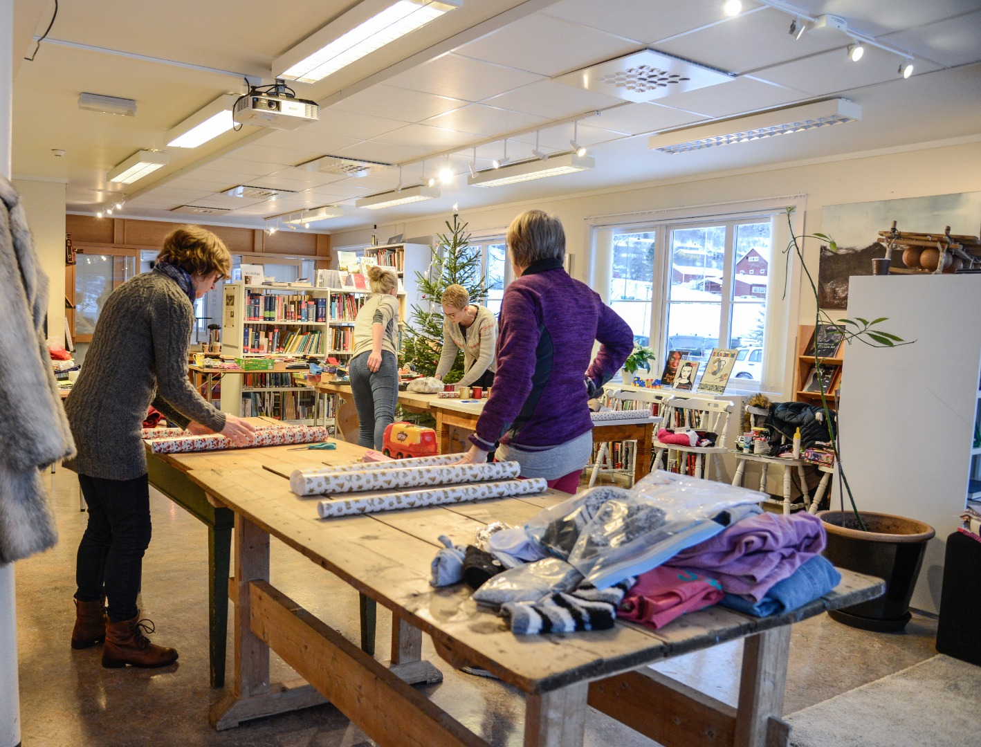 Det er roleg morgon på Vang folkebibliotek i førjulstida. På bordet er strikka sokkar, teiknesaker, leikebiler, kosebamsar og mykje, mykje meir. Rundt surrar styret i frivilligsentralen og gode medhjelparar for å fordele alt det flotte til julegåver.