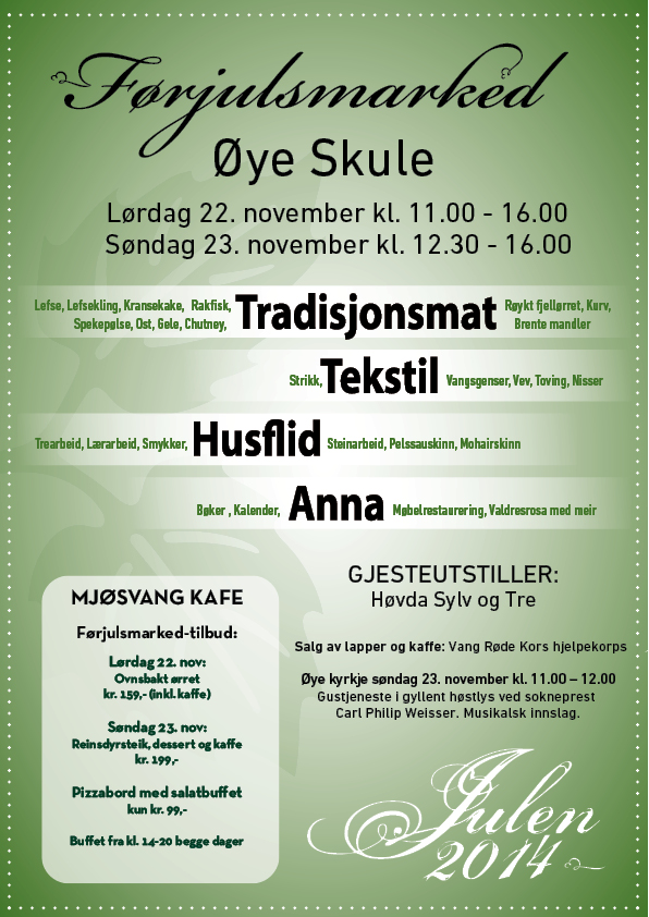 Denne helga er det klart for førjulsmarknad på Øye skule. Tradisjonsmat, tekstil, husflid og mykje anna er å få kjøpt.