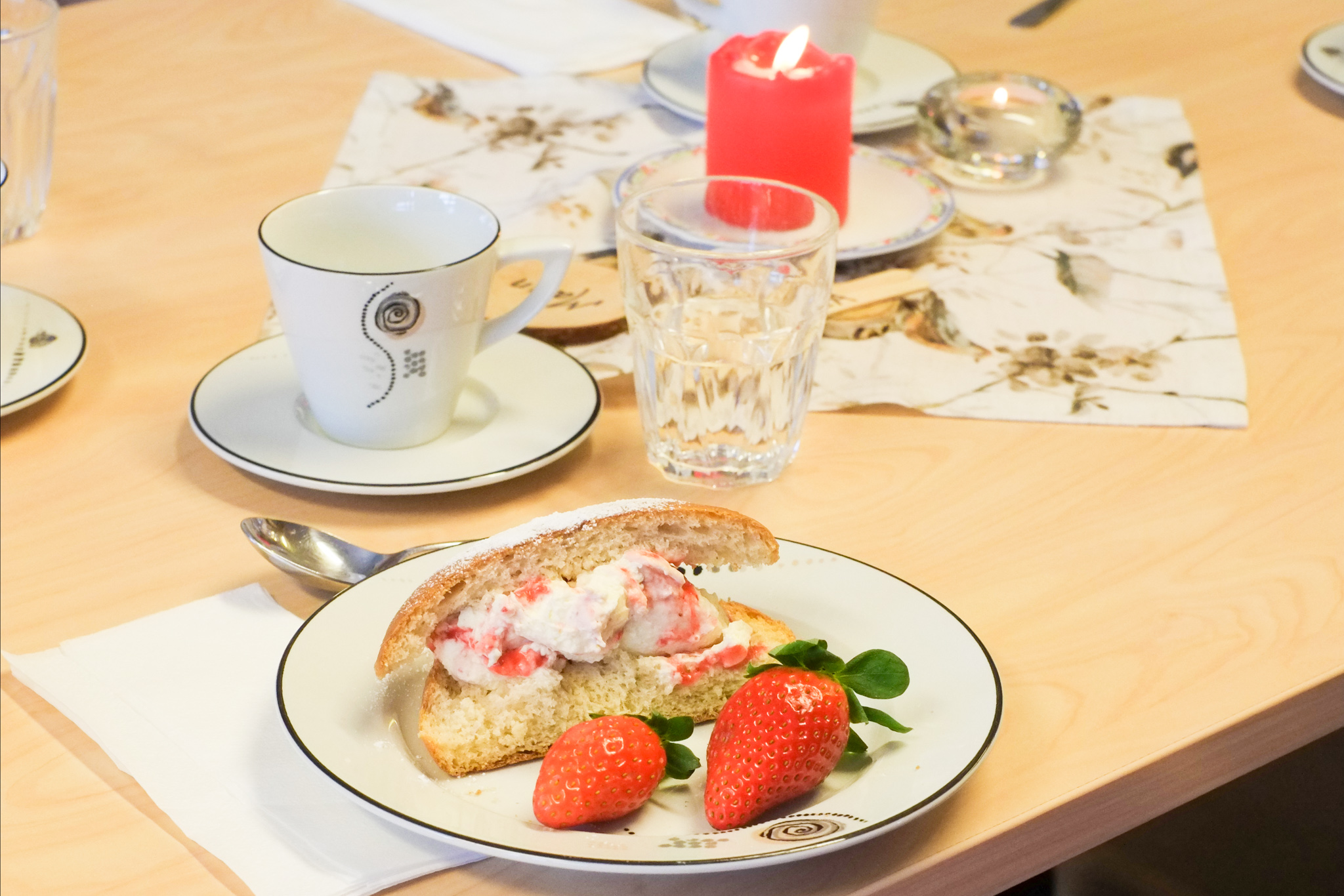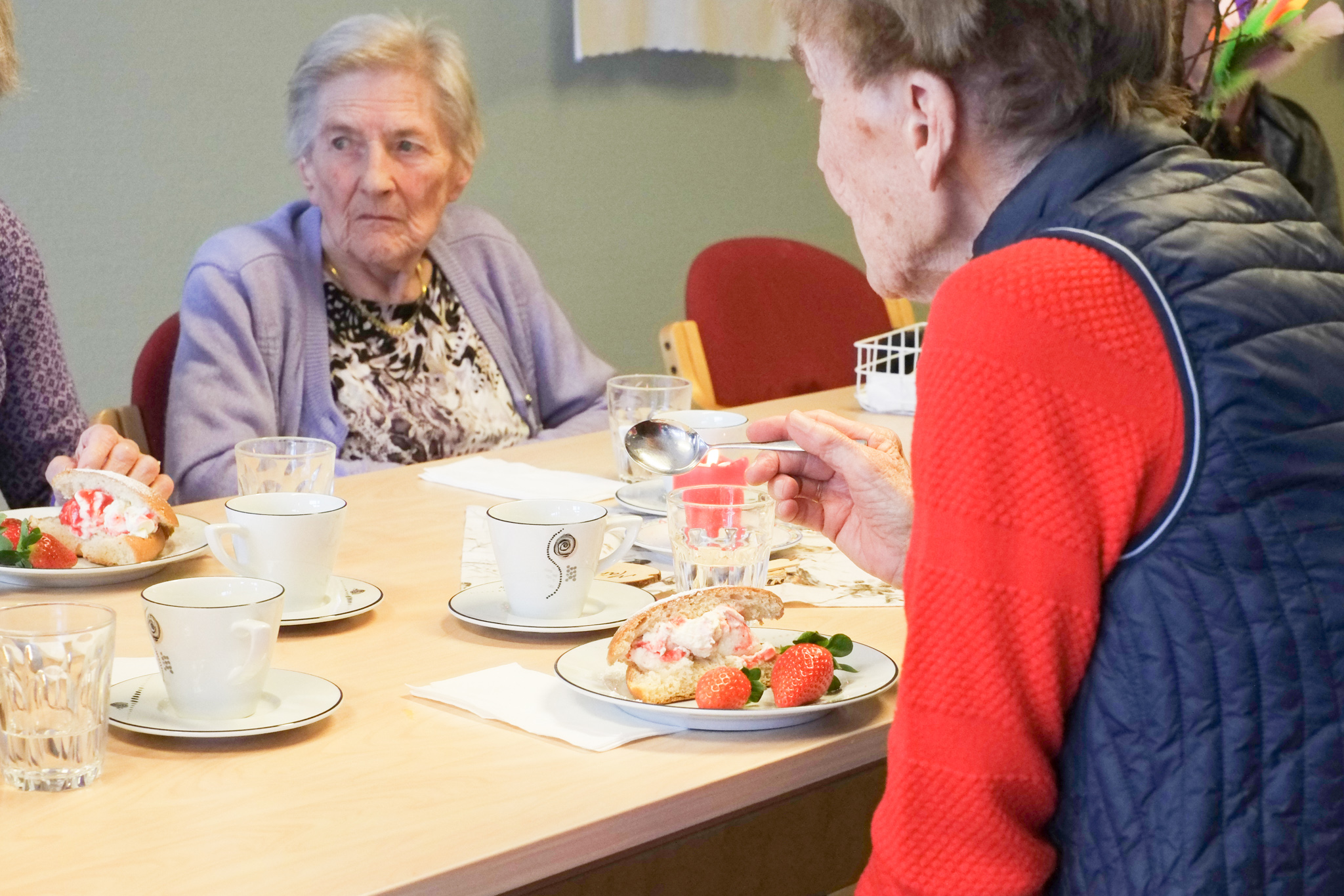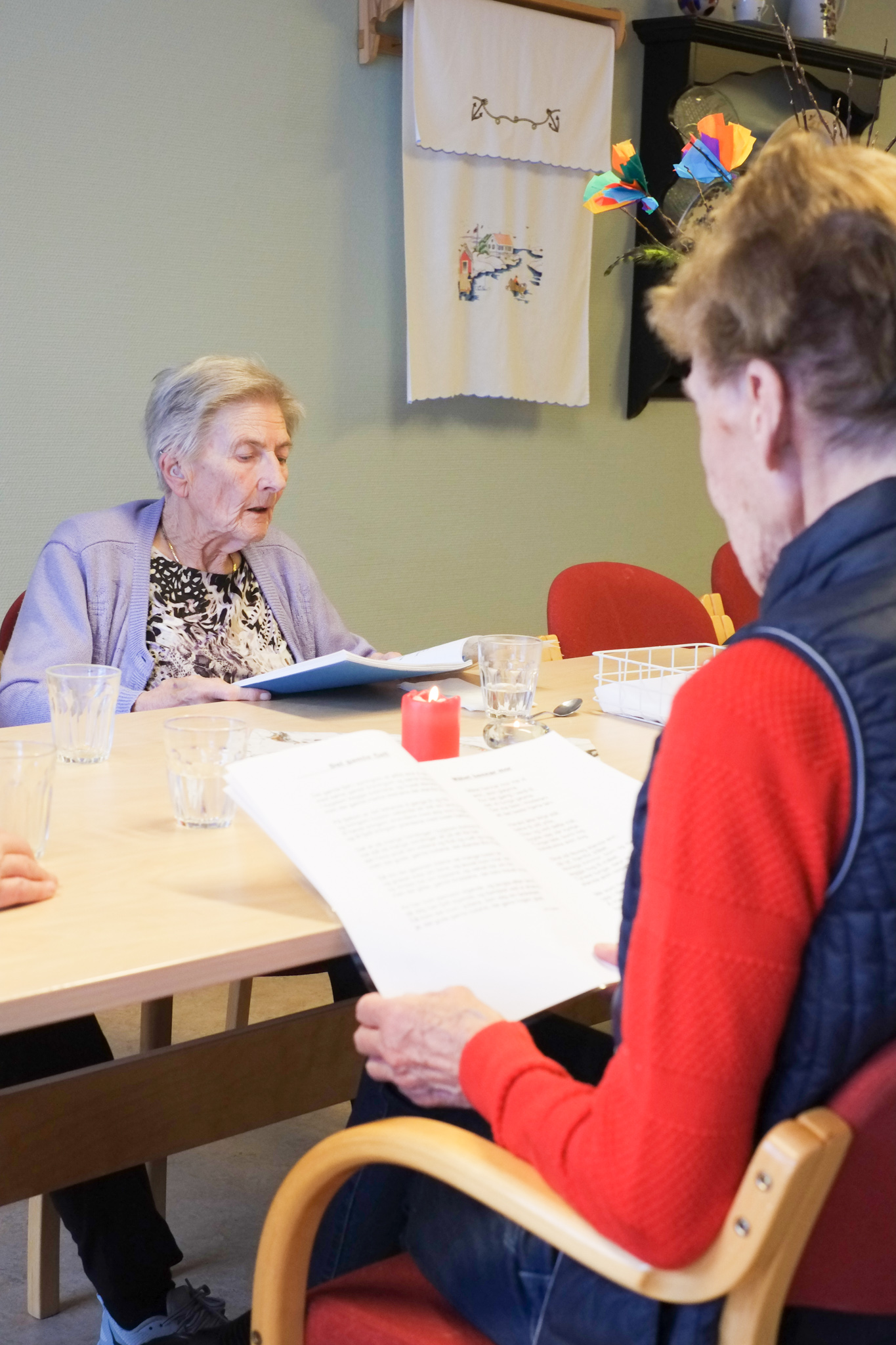 Nokon treng ein ekstra dytt for å ta del i fellesskapet. Ein av bebuarane sit ofte på rommet sitt, men når Leif bankar på og spør om han ikkje vil bli med, så kjem han også. Dei et med god appetitt, og praten går om laust og fast. Om Ukrainakrigen, om helsa, om songoppdrag og yogatriks, ski-VM og nasjonalsongen som vart spelt alt for fort. Alle er friske, - ja forkjølelse bit ikkje på slike som oss, humrar dei. Det er god stemning og kvikke kommentarar rundt bordet.