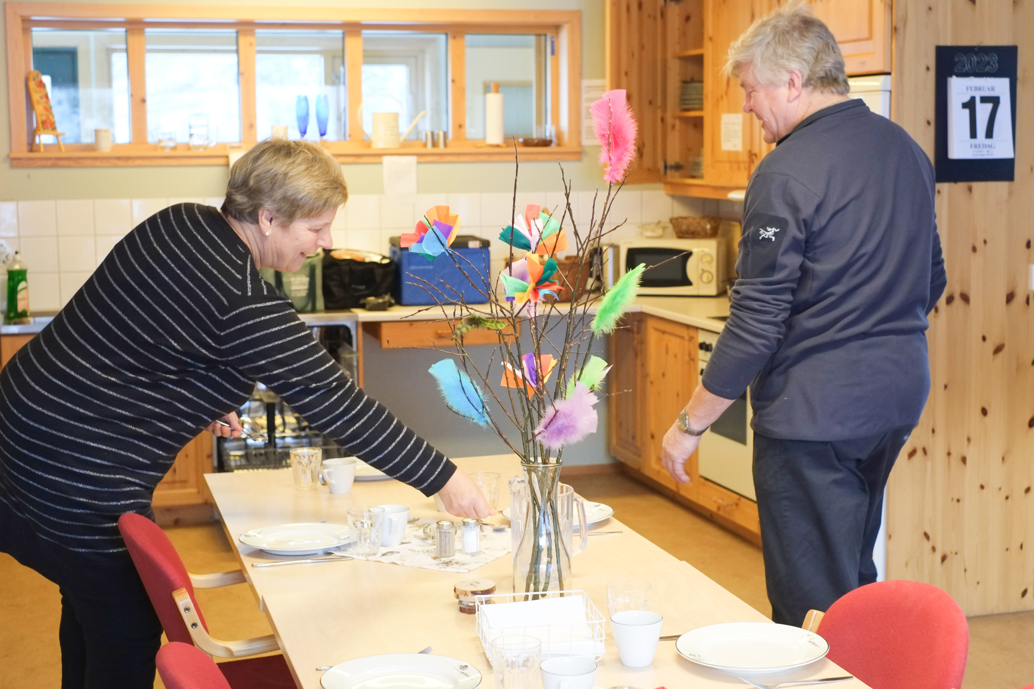 Leif og Siri-Gro dekker på og gjer alt klart rundt spisebordet. Bebuarane er tydelege på at dei set pris på dei frivillige som kjem og serverer og et saman med dei. - Det er heilt fantastisk. Dei er like trivelege alle saman, vi ser alltid fram til denne middagen.