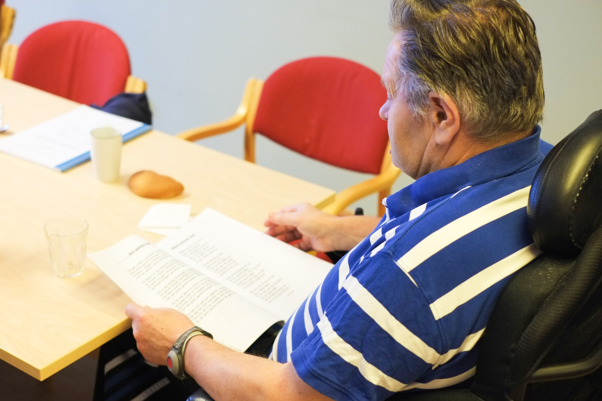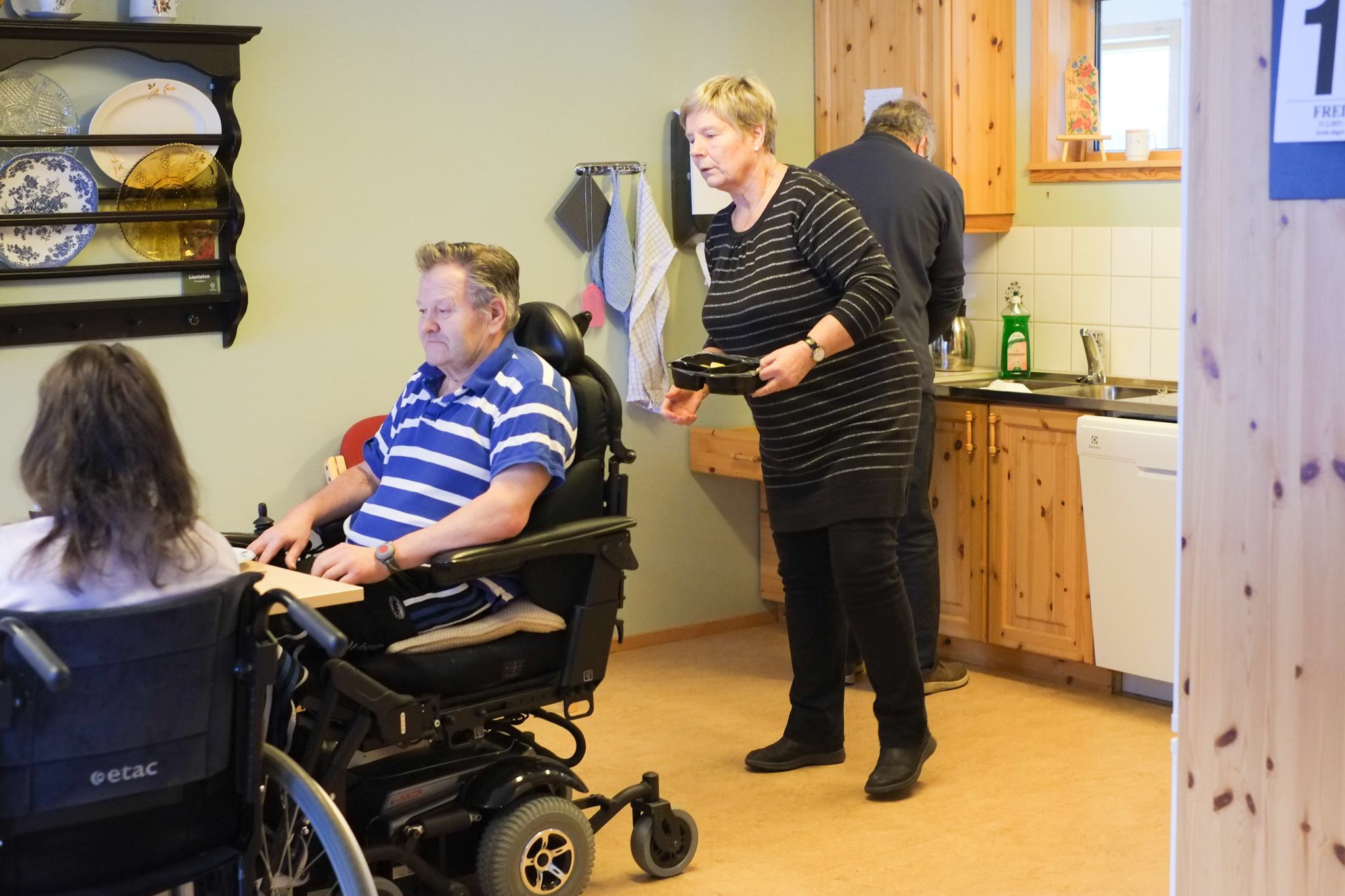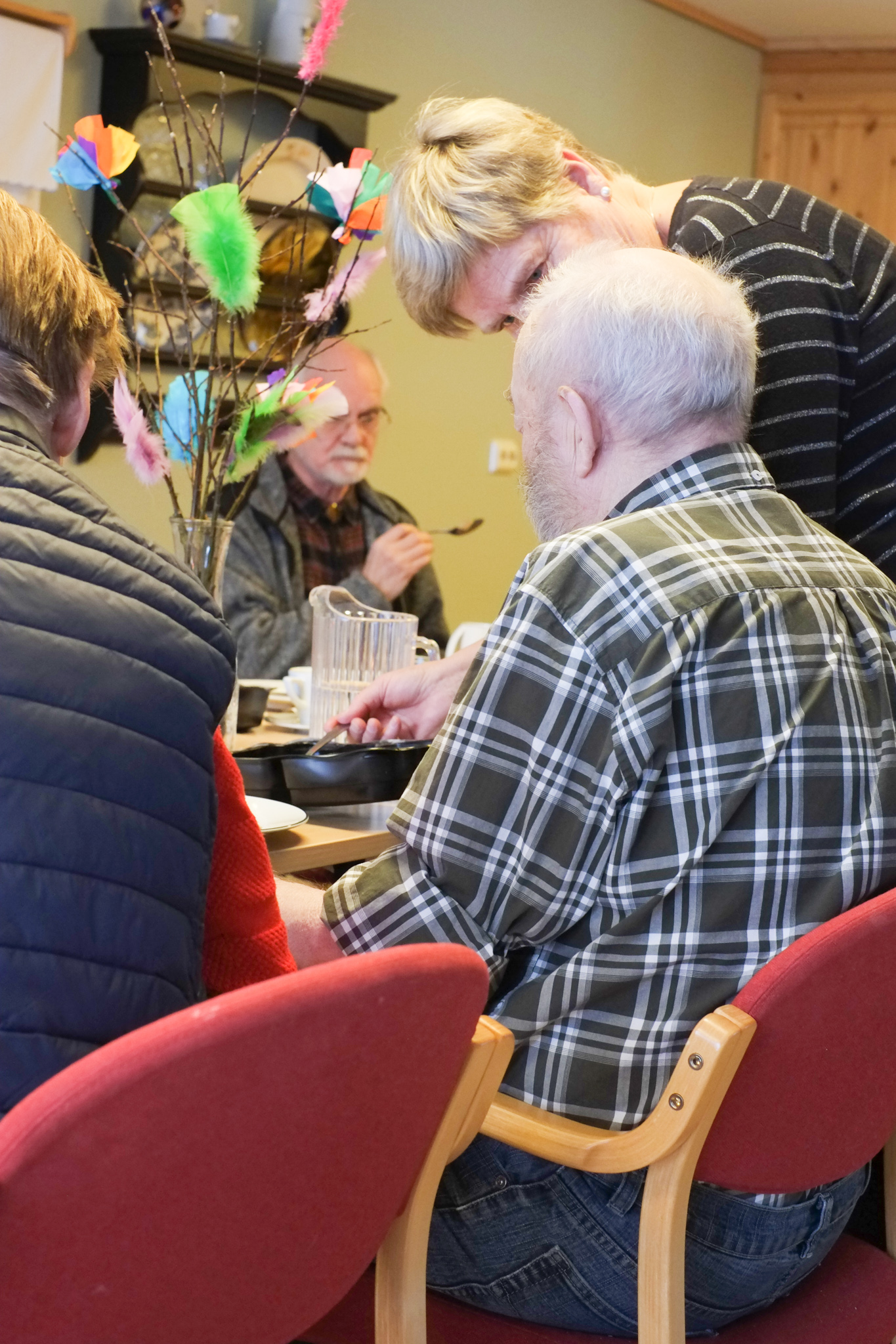 Leif er einaste mann i middagsgjengen. - Ja det synest eg er litt urettferdig for Nils her, at han ikkje får fleire karar på besøk! seier Leif. Nils berre ler, og kvitterer med at han tar til takke med det han får. Men det er tydeleg at det er fint for fleire av bebuarane at det også er menn blant dei frivillige som er innom.