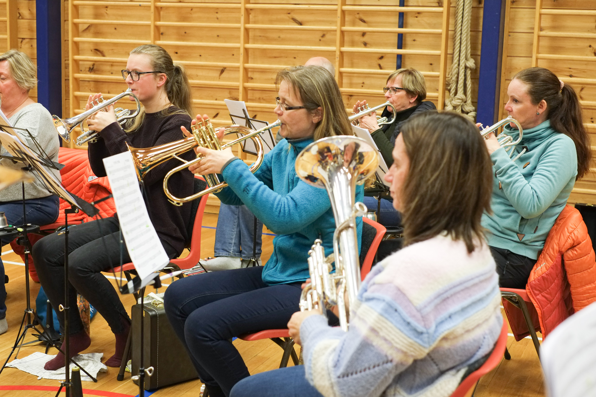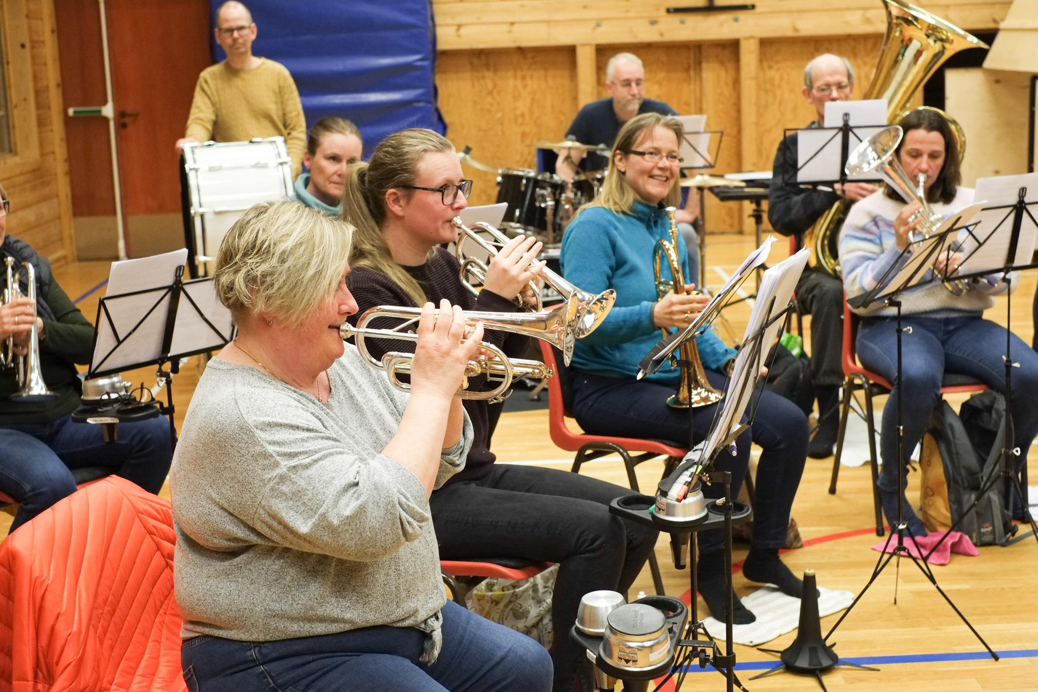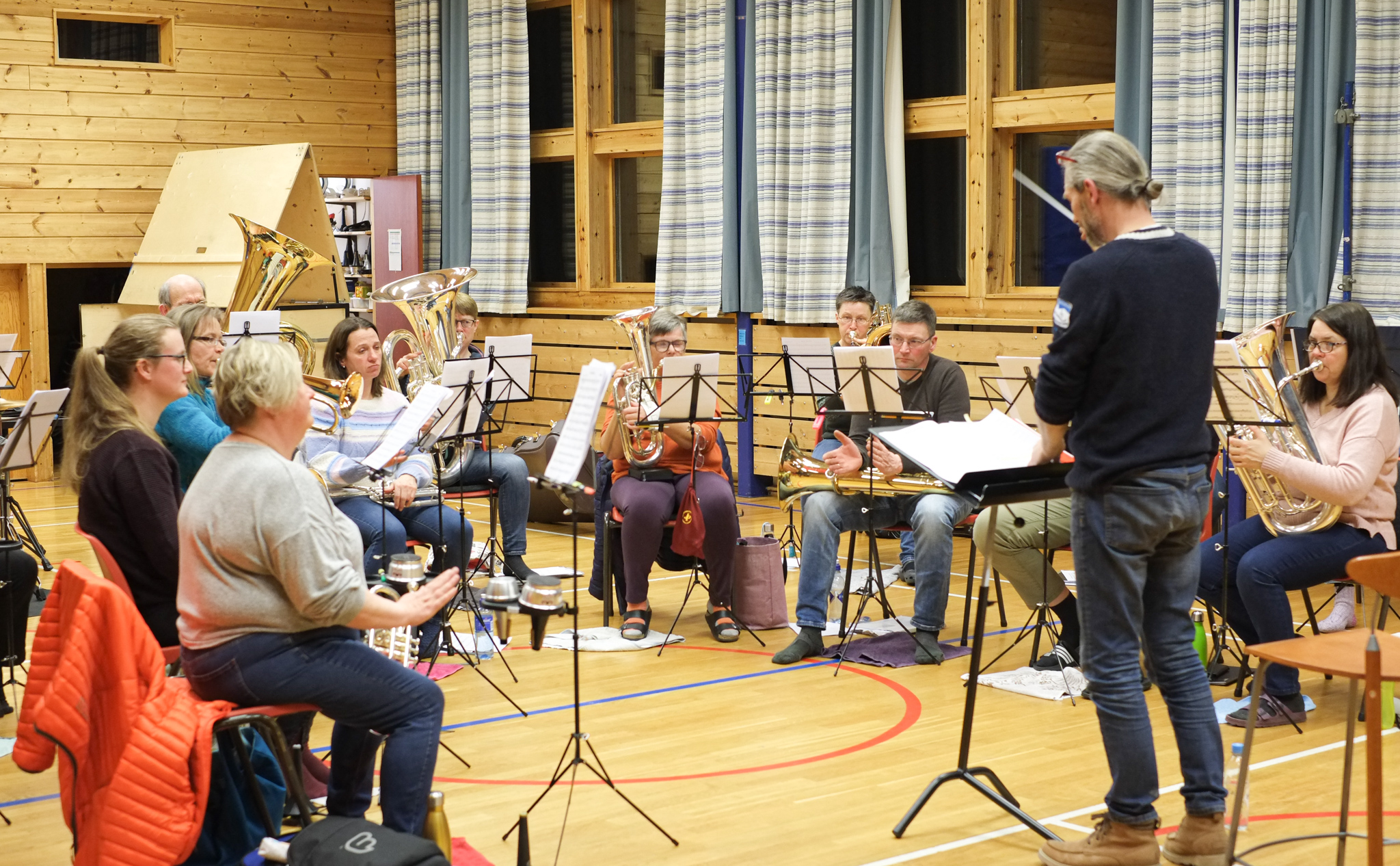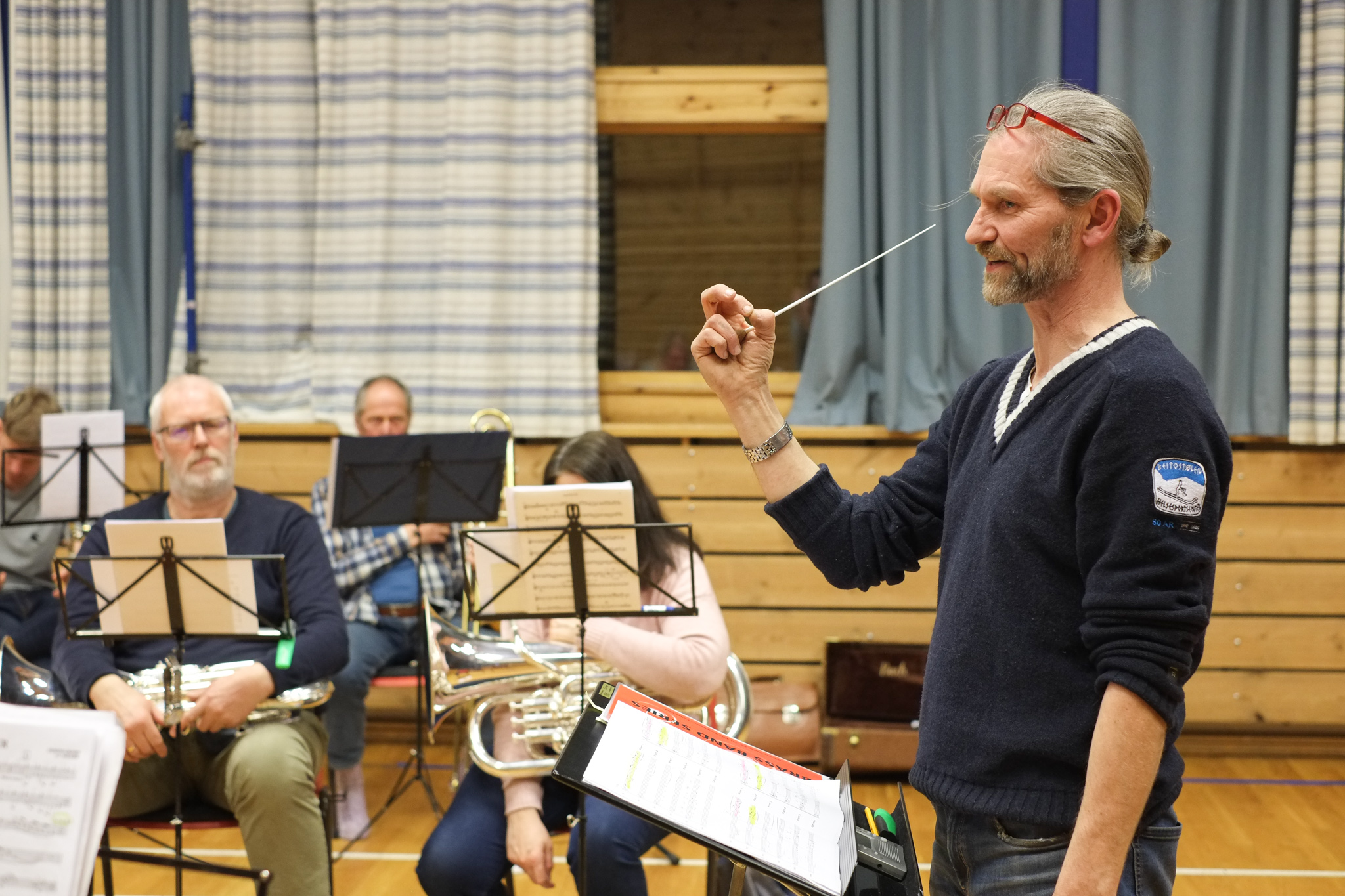 Dirigent Jostein Hillestad styrer korpset med stødig hand. Han etterlyset meir crescendo, dette blir for slapt! - Kan eg få høyre horn, 2. baryton og eufonium i frå takt 17? Her finkjemmast kvar takt og kvar tone, skjerpa øyrer lyttar intenst etter om harmoniane stemmer.