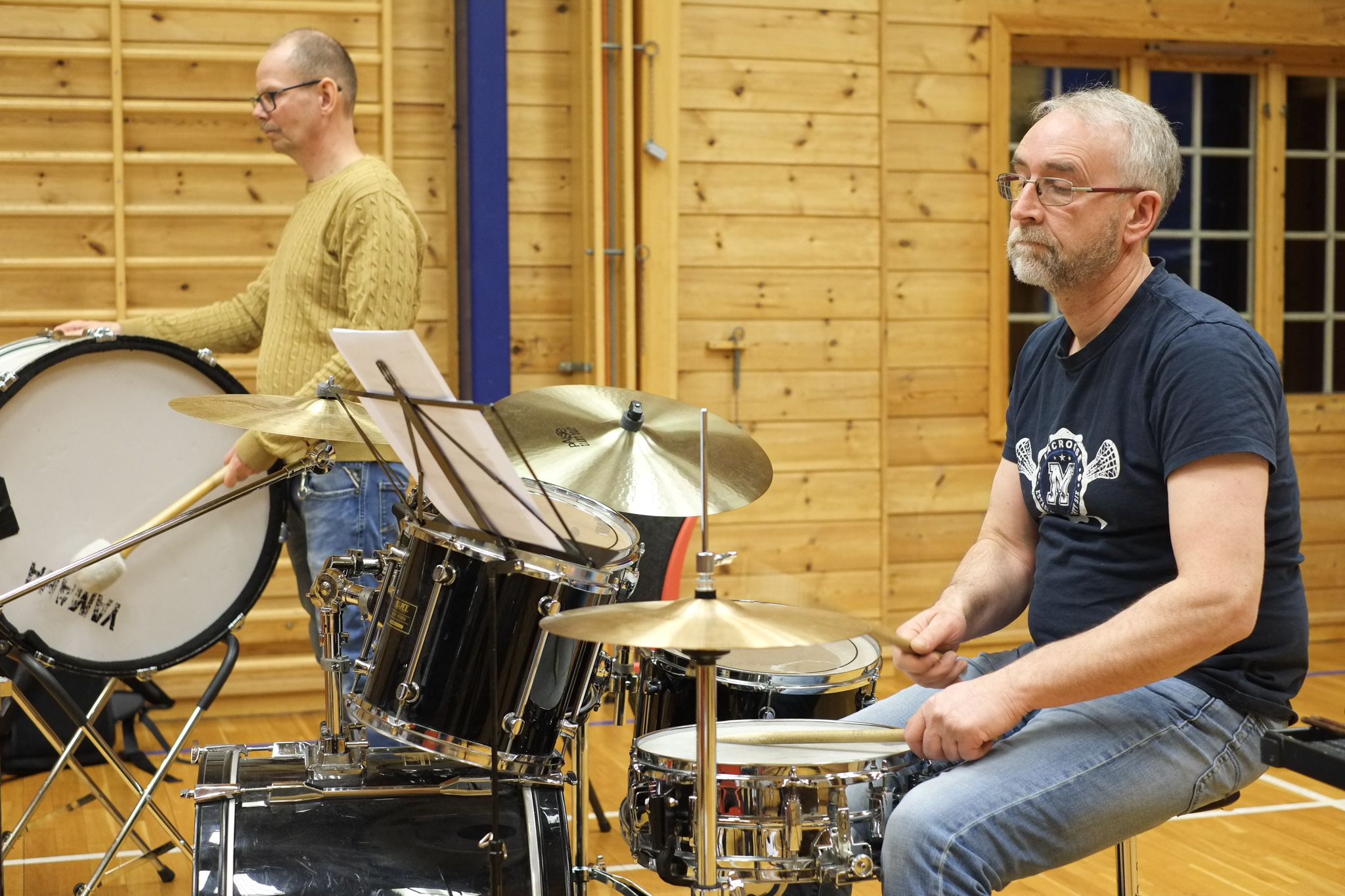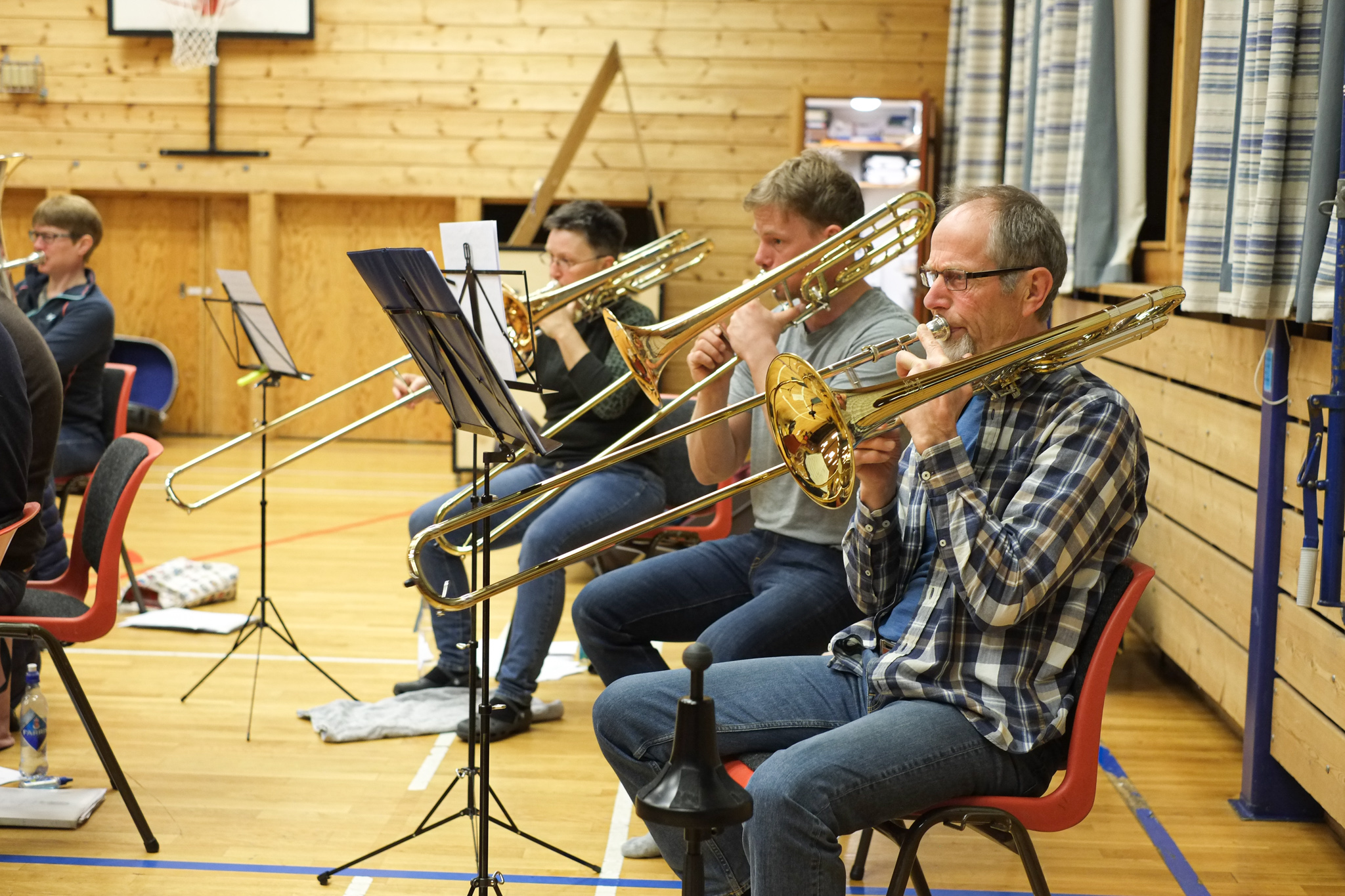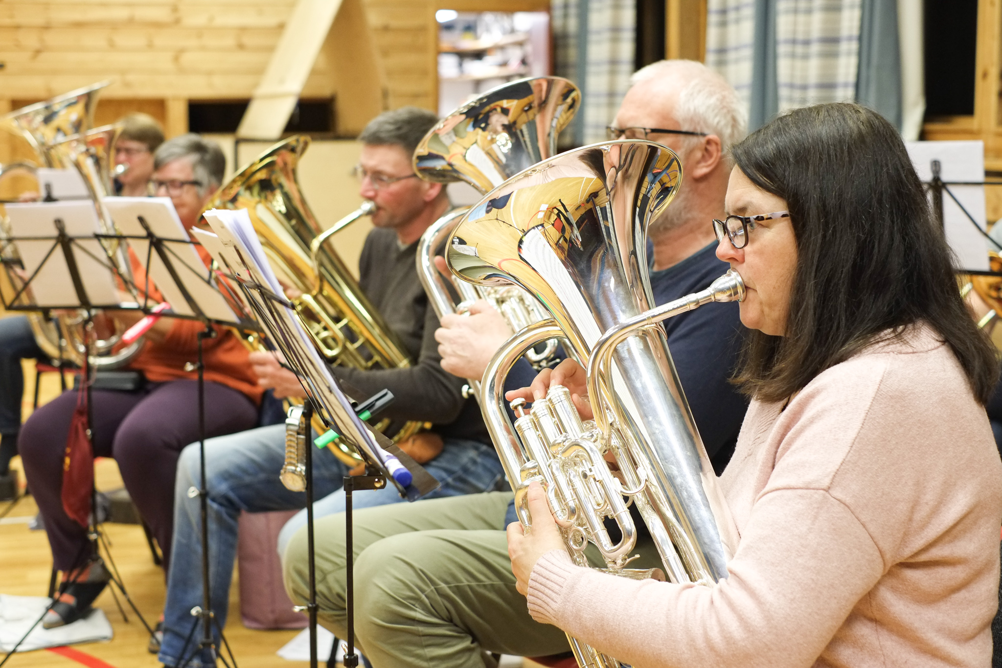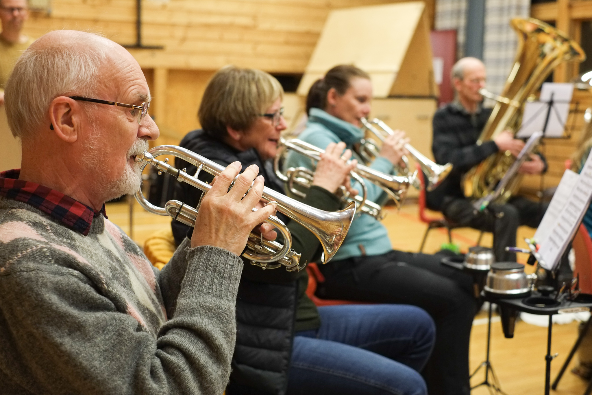 Dirigent Jostein Hillestad styrer korpset med stødig hand. Han etterlyset meir crescendo, dette blir for slapt! - Kan eg få høyre horn, 2. baryton og eufonium i frå takt 17? Her finkjemmast kvar takt og kvar tone, skjerpa øyrer lyttar intenst etter om harmoniane stemmer.