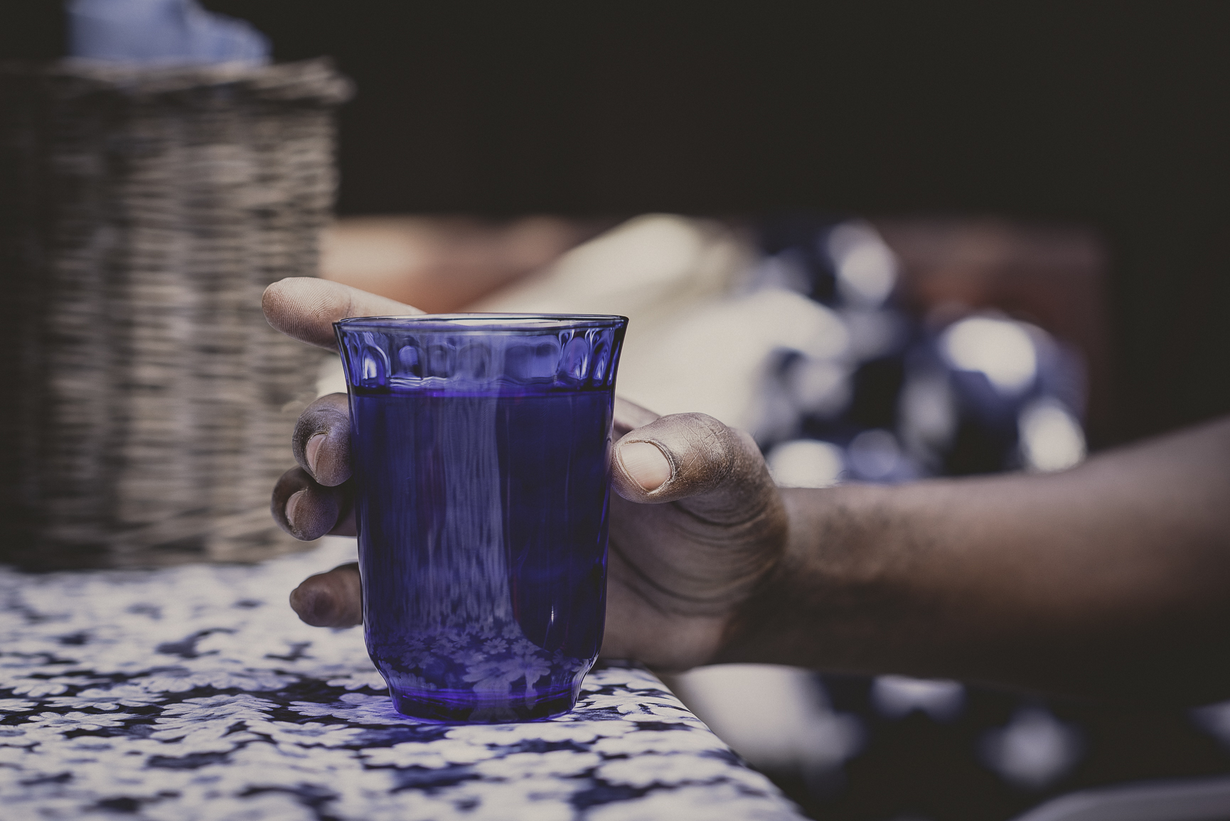 Etter ei økt arbeid er det tid for ein pust i bakken og Inger serverar heimelaga rabarbrasaft og te under parasollen.