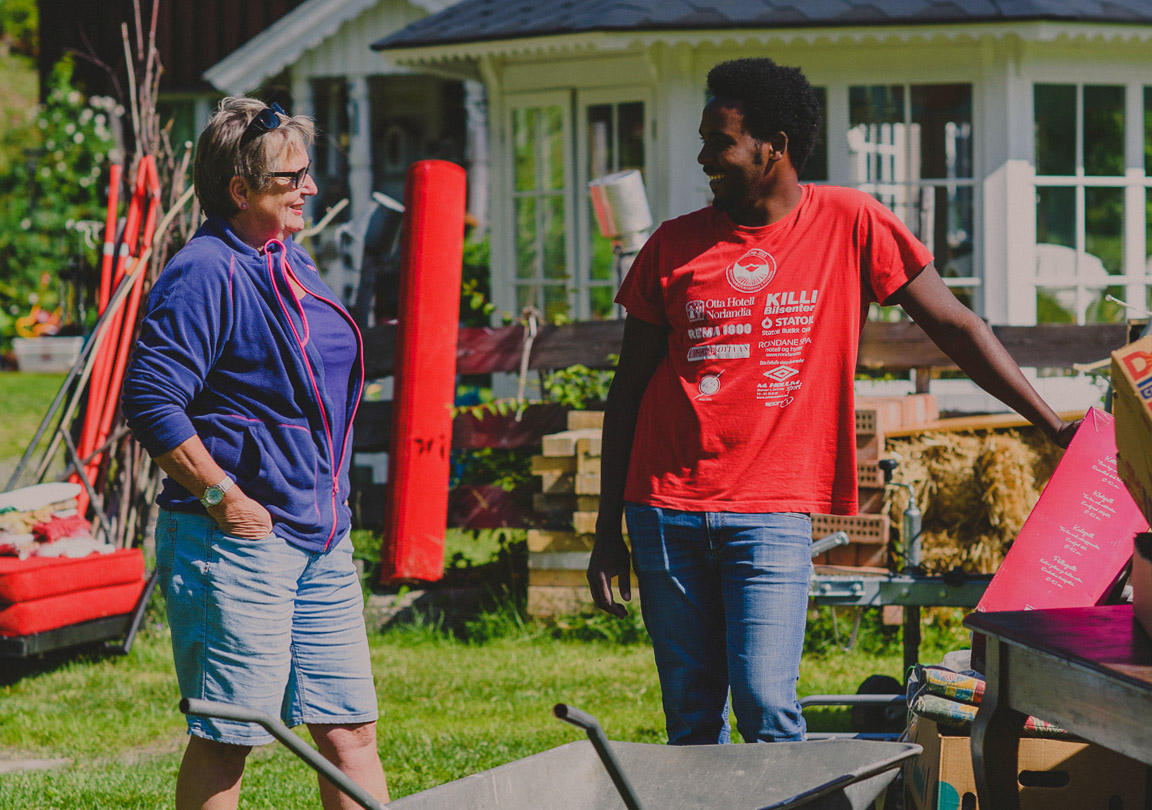 - Erfaringar frå arbeid i bedrifter vil nok vere enno meir nyttige enn å jobbe hjå privatpersonar som meg. Ein lyt bygge opp folk. Eg håpar prosjektet kan bli ein god start for fleire av dei busette flykningane. Dette freistar til gjentaking, avsluttar Inger, før ho og Samuel tek den siste slurken av rabarbrasafta og tek til at med arbeidet.