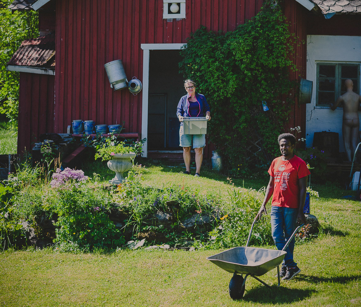 Sola steiker på himmelen, grusvegen smalnar inn, det dukkar opp eit idyllisk gardstun i skogkanten. Inger småpratar med Samuel Y. Gebreslase når eg kjem inn på tunet, han har trillebåra fylt opp av ting og tang, det er ikkje godt å sjå kva alt kan vere.