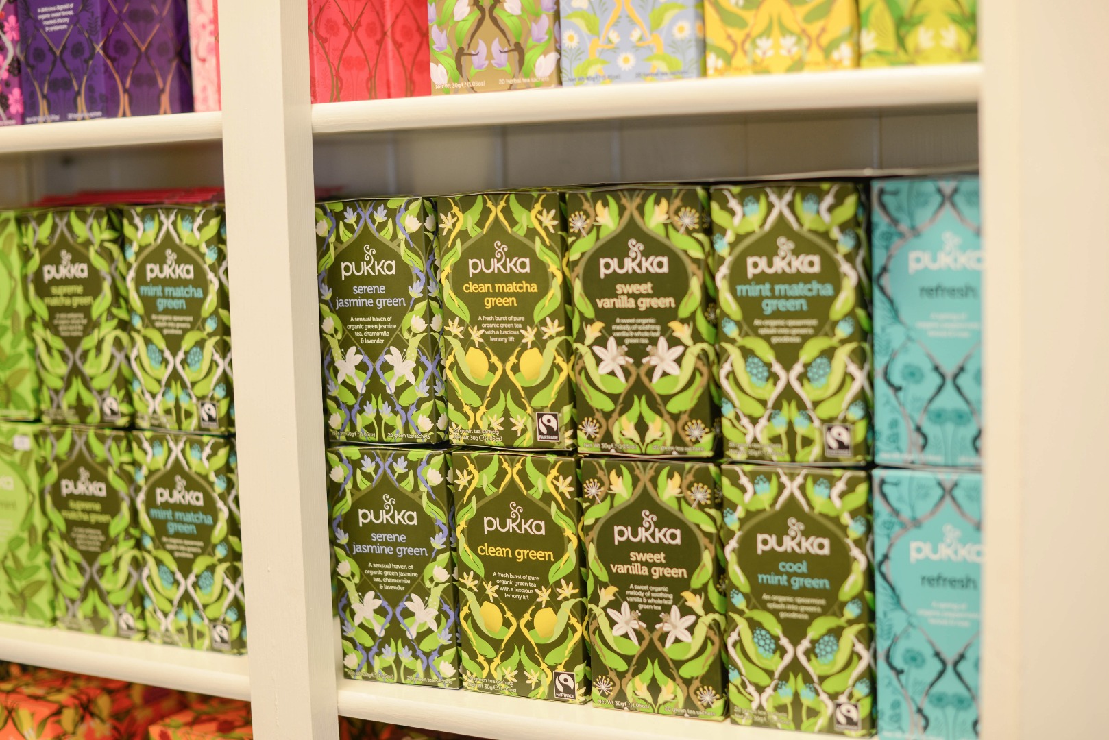 Pukka te, kvalitets duftljos frå Skandinavisk, mineralsminke frå Jane Iredale og Caroline Heyerdahl sine kjemikaliefrie vaskeprodukt er andre produkt til sals.