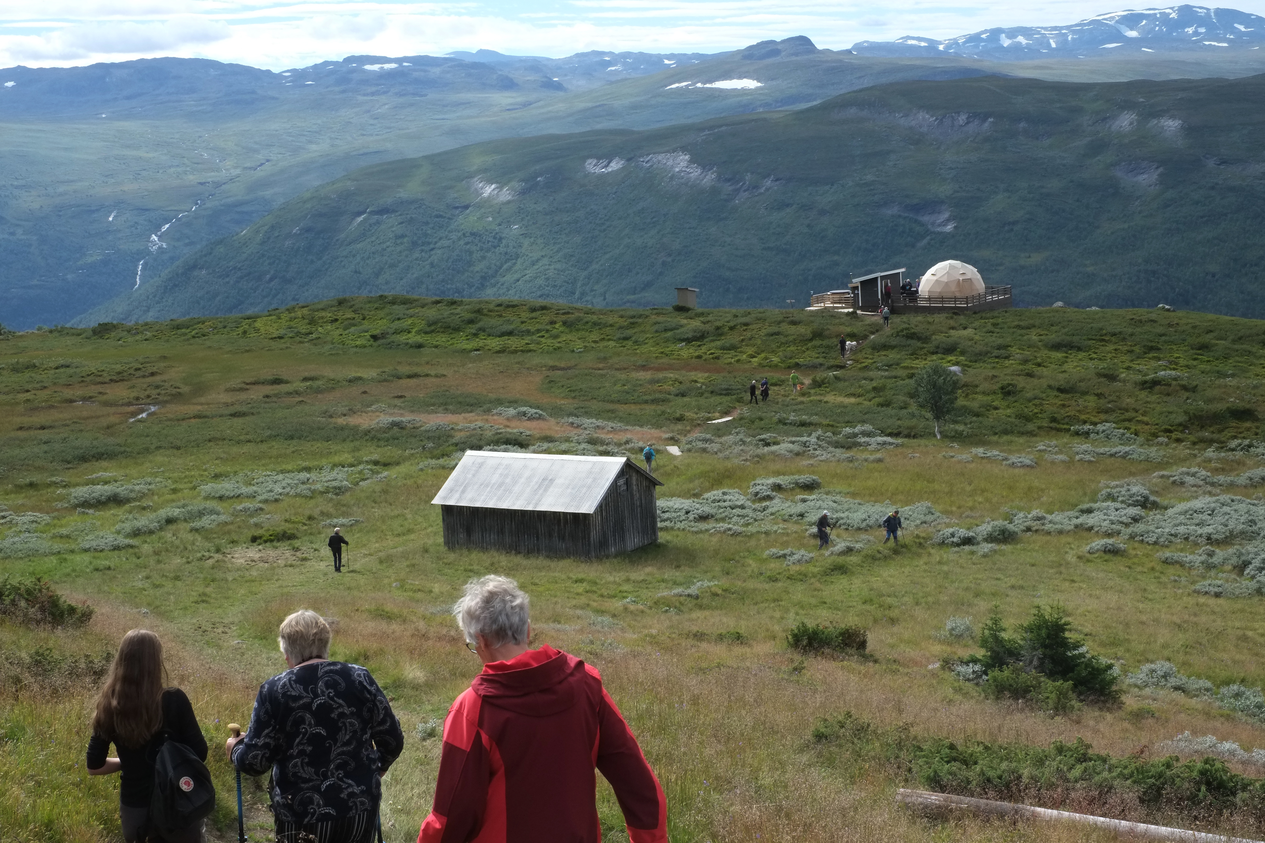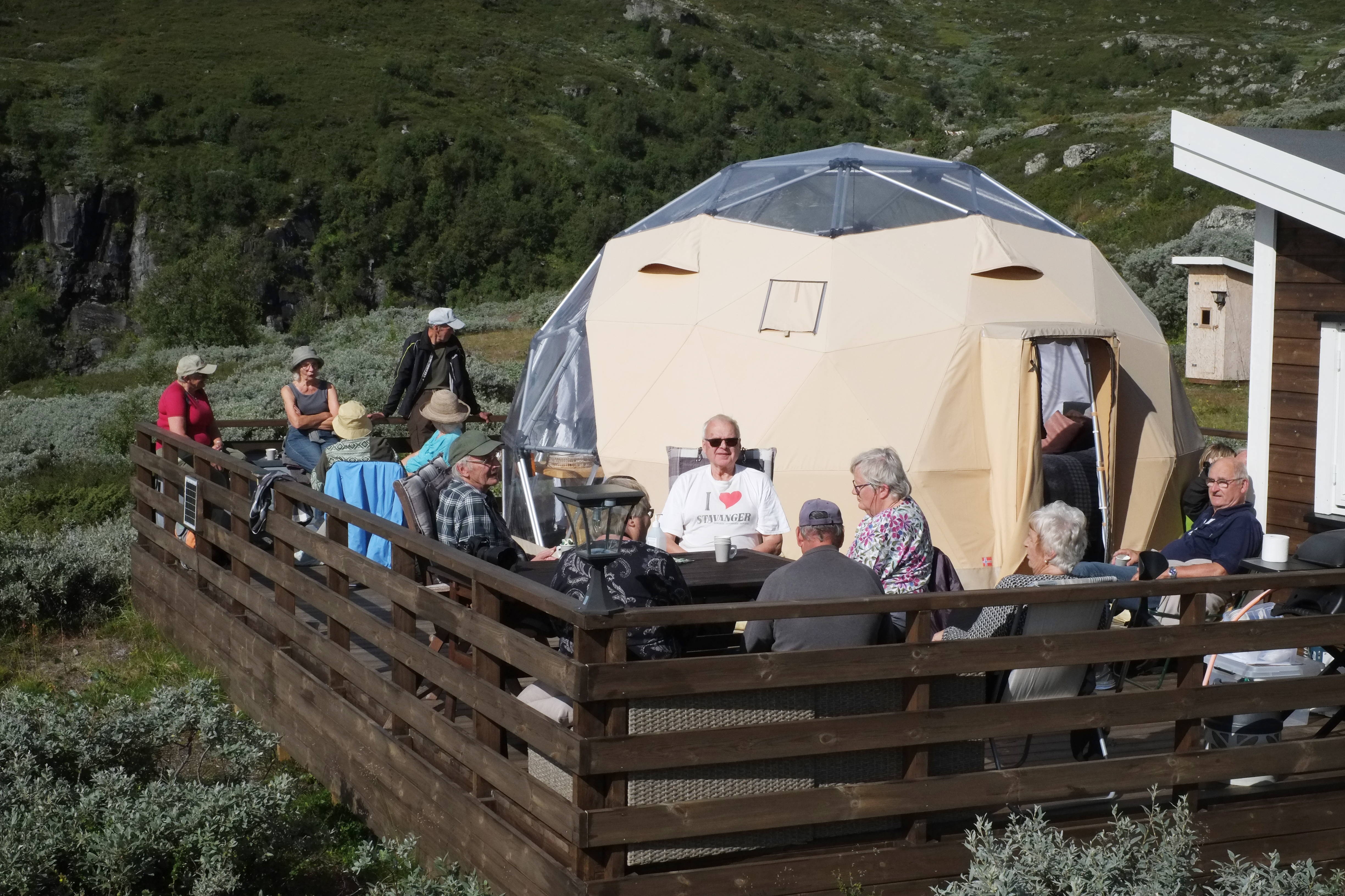 Vi er på Jonsgard for å vitje Valdres Artic Dome, to overnattingskuplar i vilt og vakkert terreng, bygd og drifta av tvillingane Øyvind og Åsmund Ekerbakke Stende. Pensjonistlaget er som oftast på fleirdagsturar utanfor eigen kommune, men denne solfylte augustdagen skal dei oppleve eit av dei nyaste reiselivsprodukta Vang har å by på – og eg har fått lov til å vere med. Snakk om ein flott arena for å snakke med medlemmane og dei frivillige, og skrive ein presentasjon av laget.