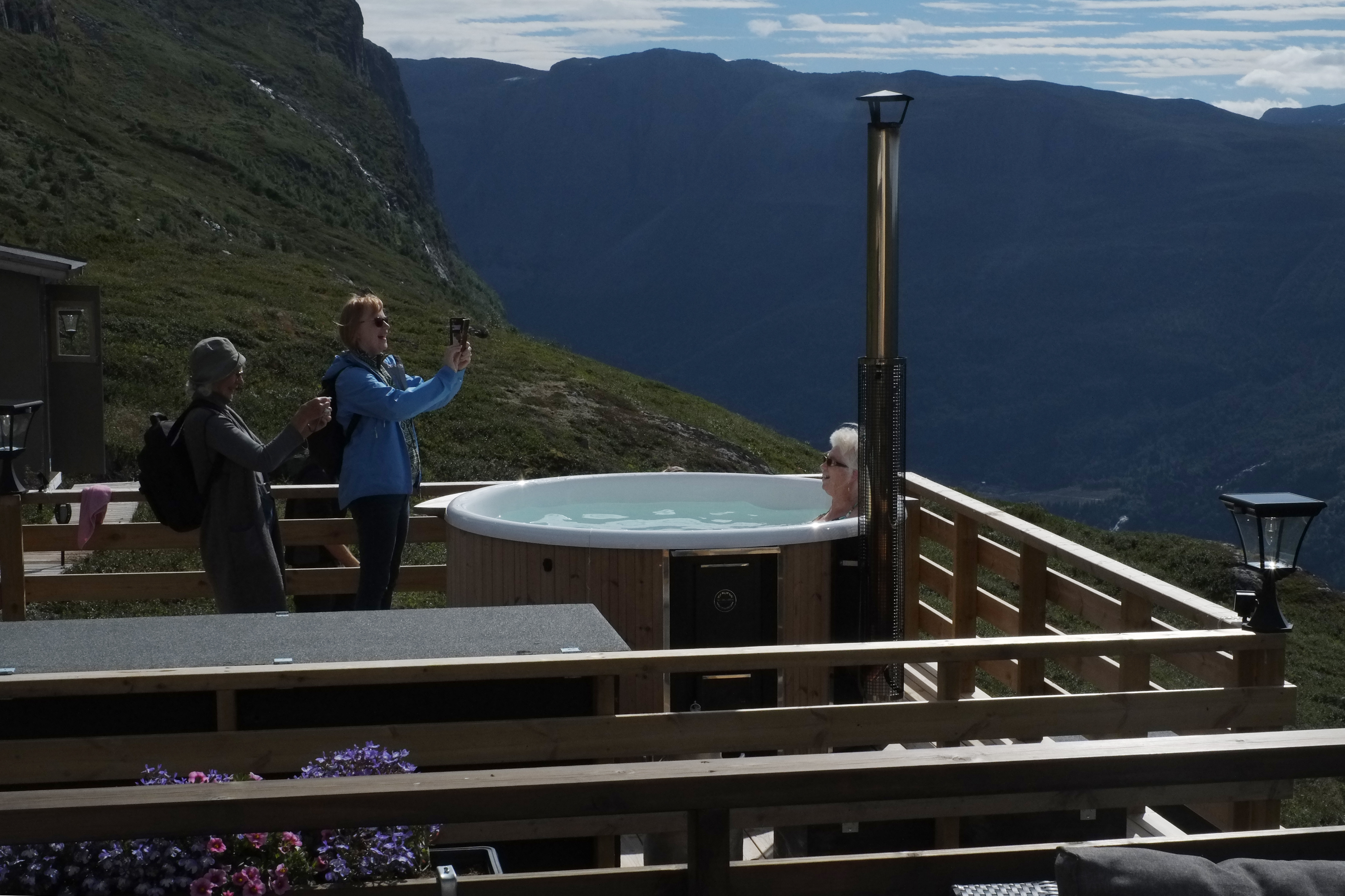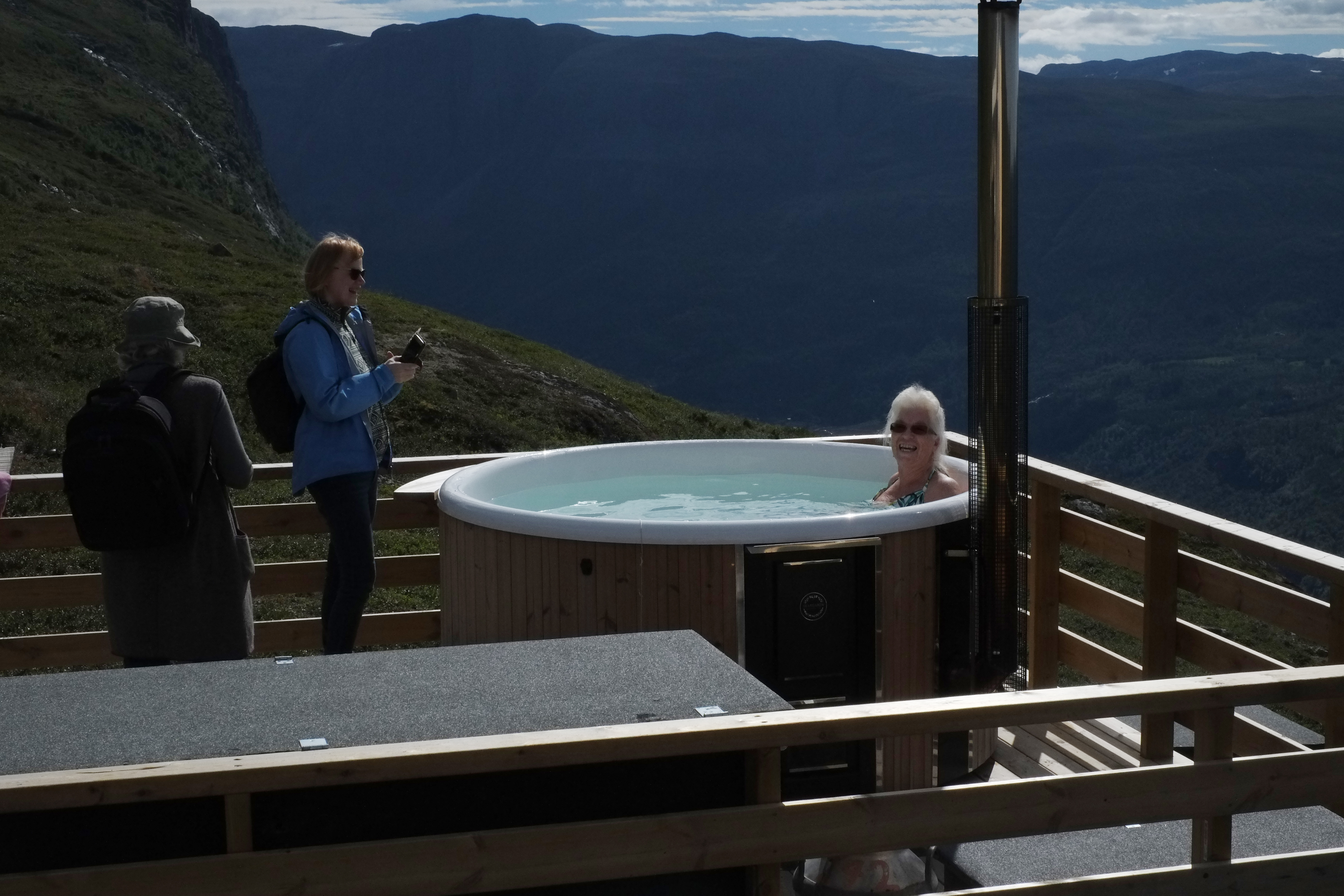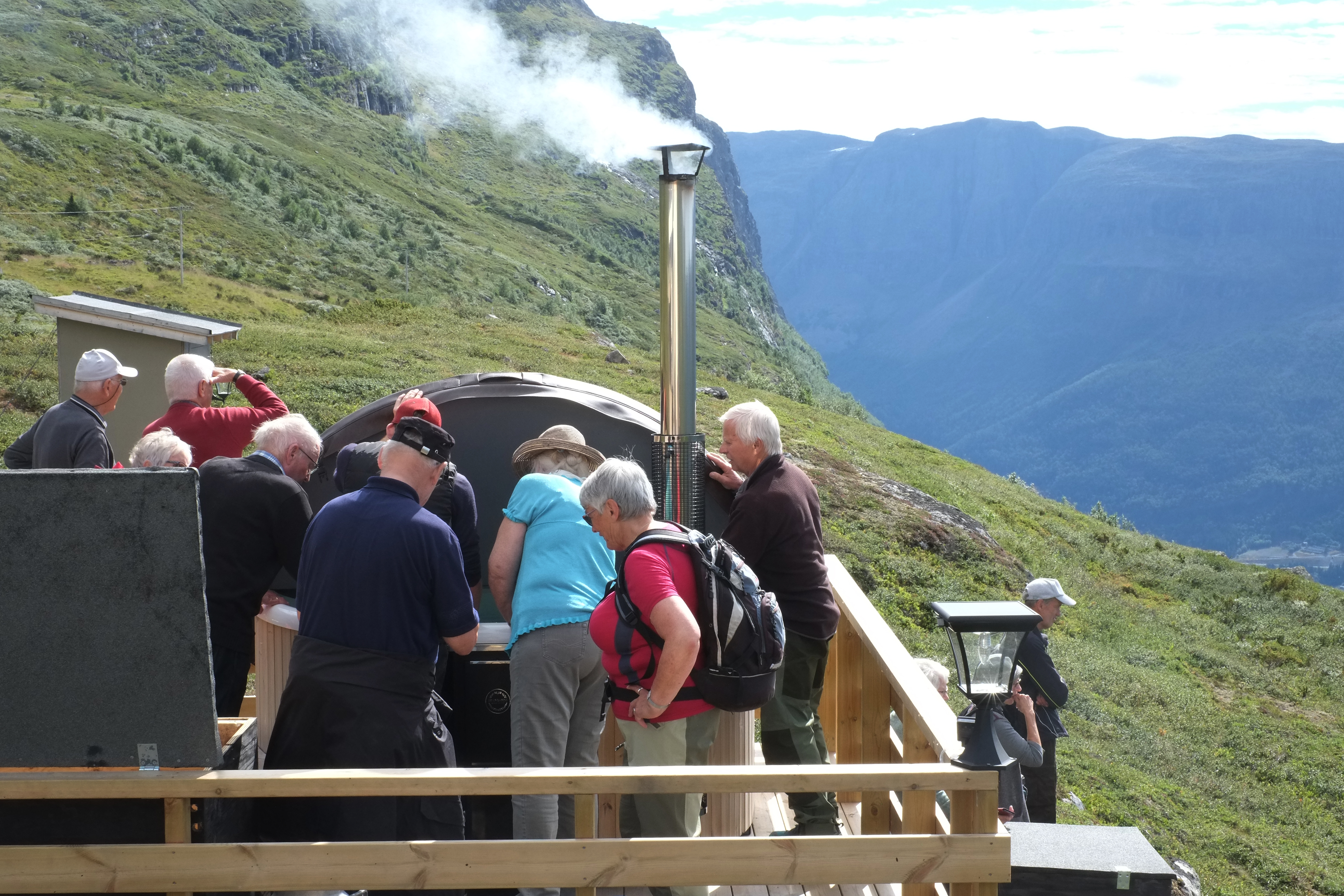 Fleire stiller spørsmål om drift og utstyr, ein del har erfaring med reiseliv og utleige sjølv, det utvekslast erfaringar og gode råd. Øyvind og Åsmund viser fram stampen, mange inspiserer innreiinga med stor interesse, men berre èi har med badedrakt og hoppar uti; – Dette var herleg! kvitterer Ingunn Hommedal, - det stod jo at ein kunne prøve så då måtte eg nytte høvet!