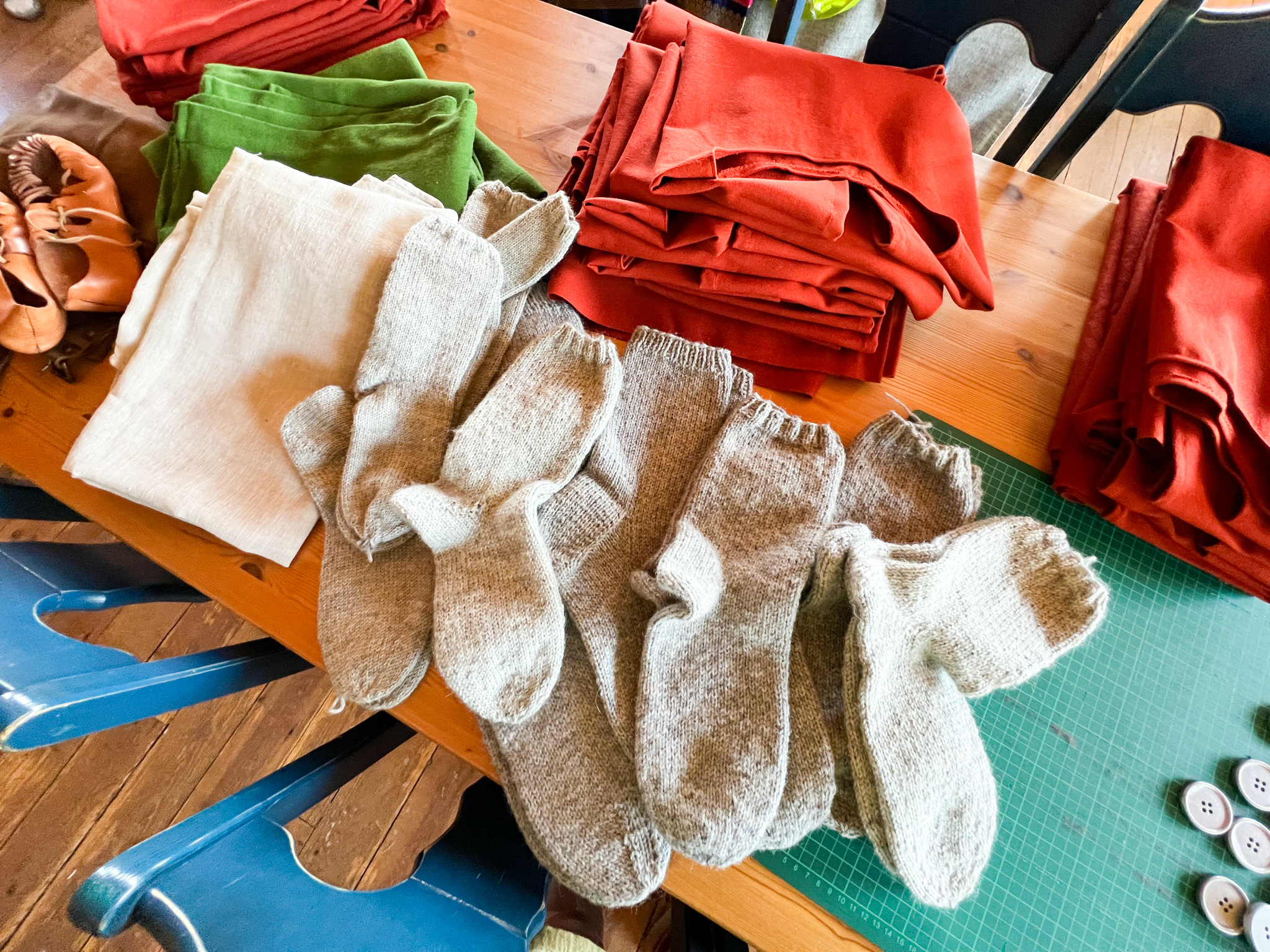 - I tillegg til oss som har sydd kostymer har Strikkekafeen på Haukåsen bidratt med å strikke sokkar til skuespillerne, og Ung Husflid har flettet belter til koftene, smiler Havro.