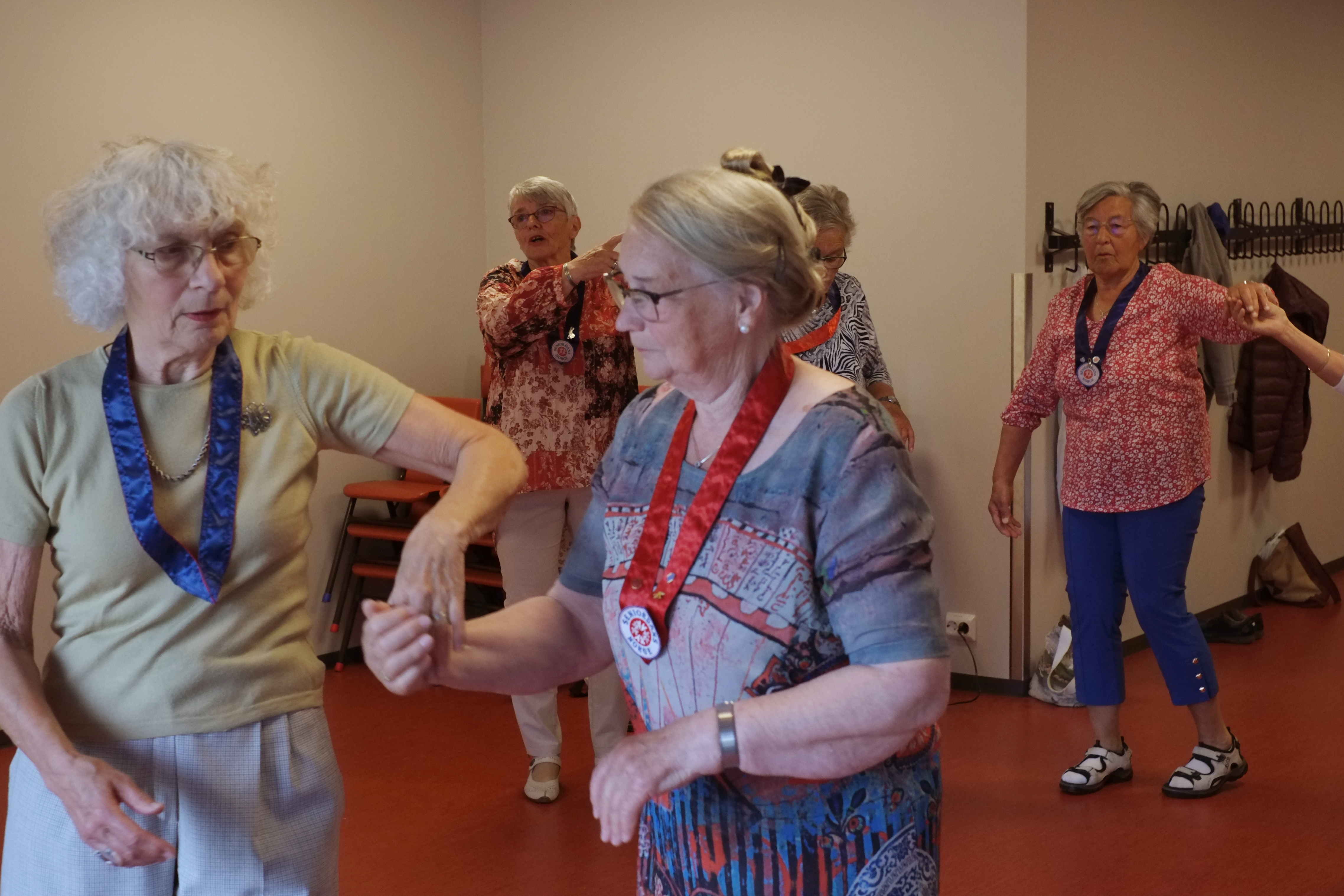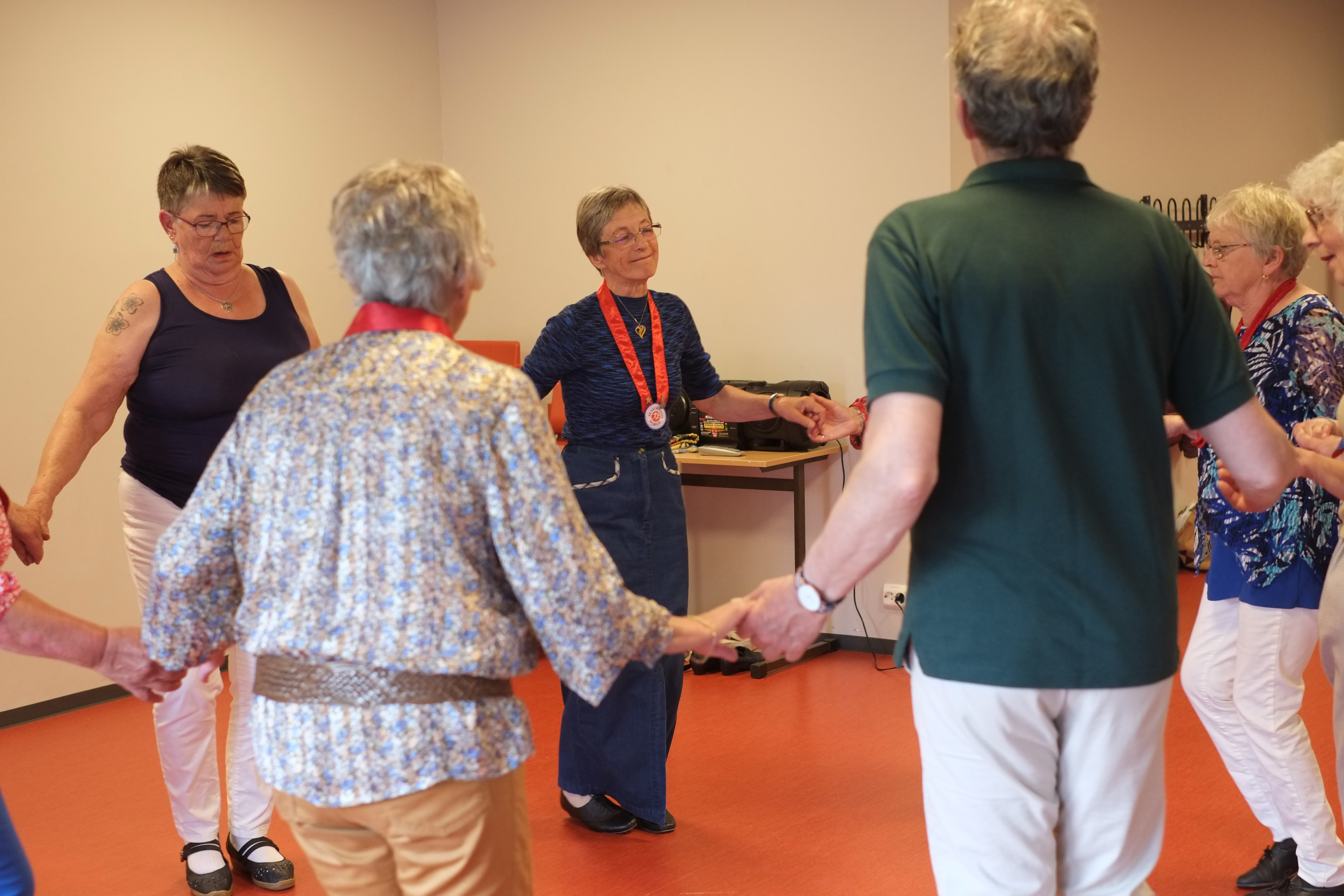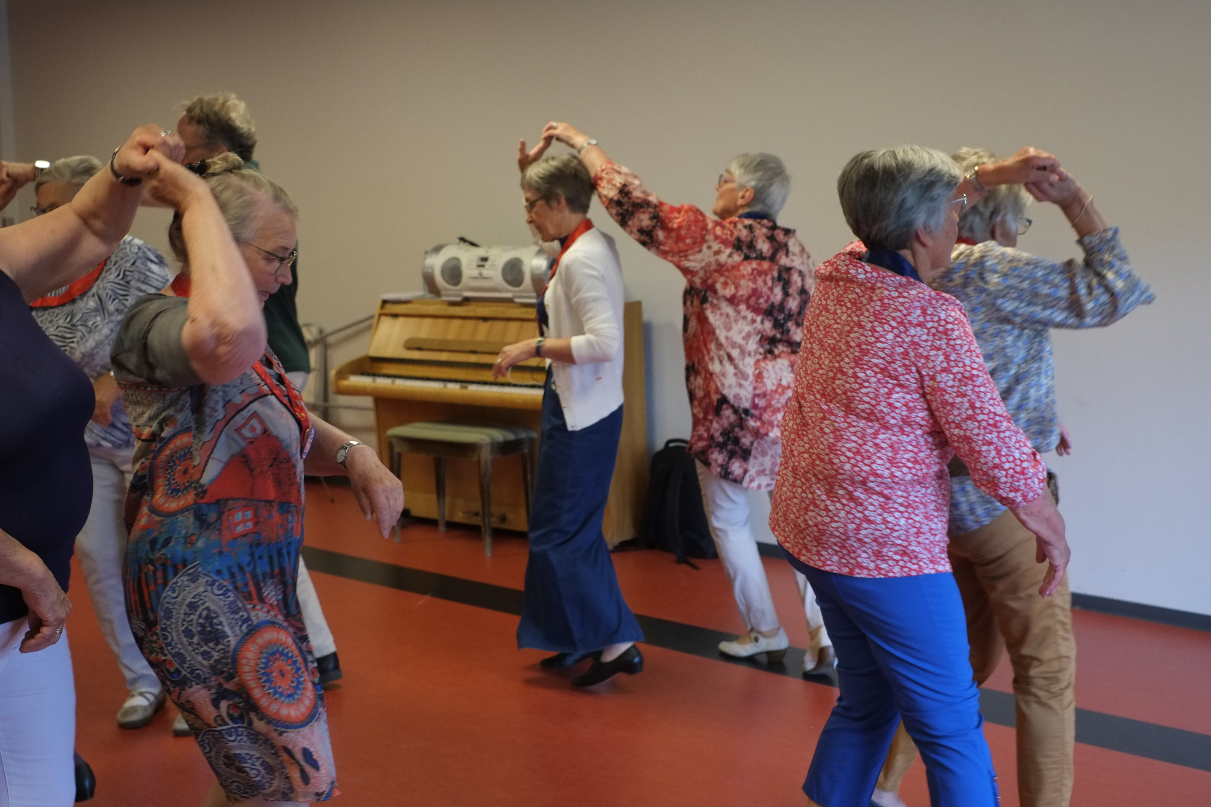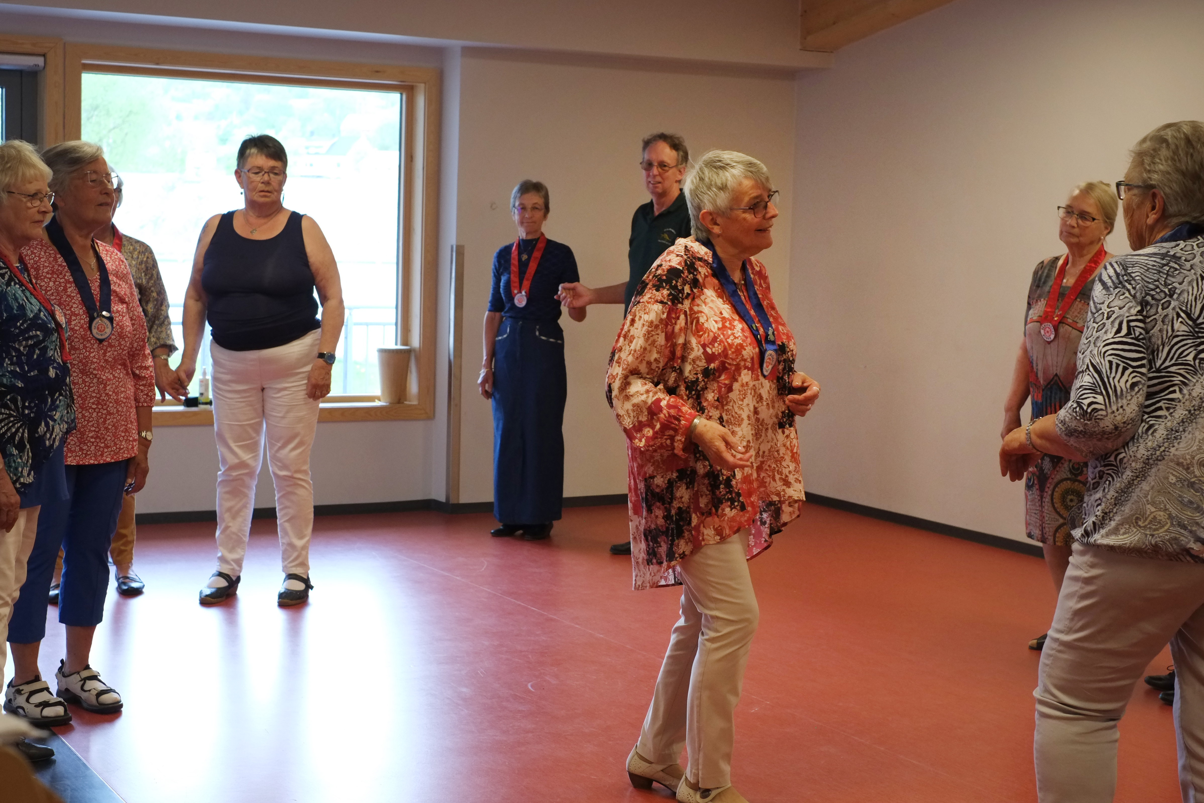 Bozzanova, rumba, reinlender, ringdans, stjerneformasjon, par og solo. Her er det ingen tvil om at både kondis, koordinasjon og hugsen får køyrt seg. Mellom konsentrerte blikk er det smilande fjes som nyt musikken. Og litt latter når koreografien går i surr. - Den der må vi ta ein gong til, det er alle einige om. Nokre oppklarande instruksjonar og så er stega på plass.