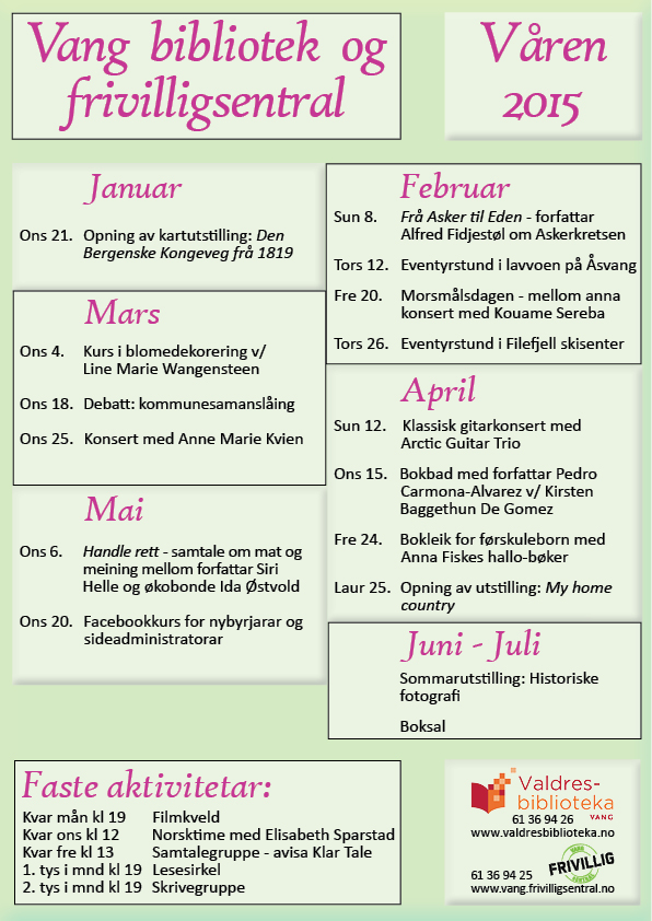 Kvalitet over heile fjøla er den beste skildringa av vårprogrammet til Vang Frivilligsentral og Vang folkebibliotek.