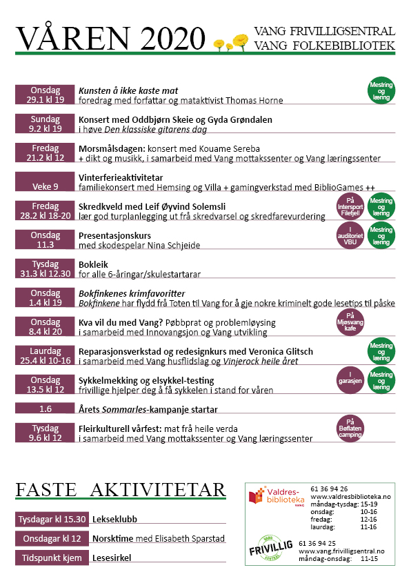 – Vi minner også om at Elisabeth Sparstad held fram med norsktime kvar onsdag, lekseklubben er ope kvar tysdag, og lesesirkelen held fram med plass for både nye og gamle lesarar. Velkomen til ein spanande vår på biblioteket og frivilligsentralen i Vang, avsluttar Tangen.