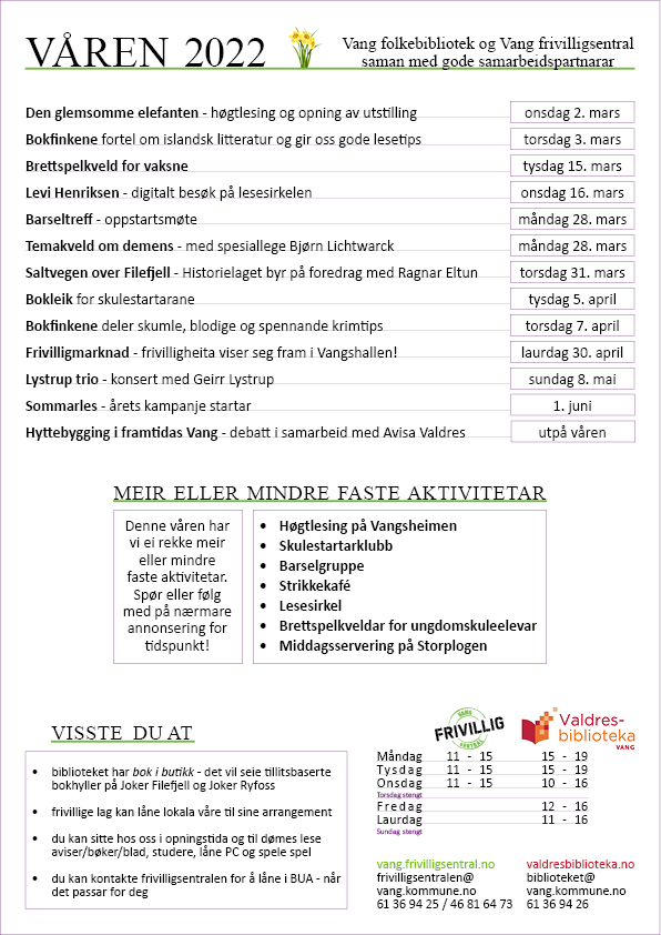 Eit heidundranes program er no spikra for våren i Vang. Anten du er glad i brettspell, engasjert i hyttebygging eller vil delta på årets Sommarles - her er mang ein godbit både for liten og stor!