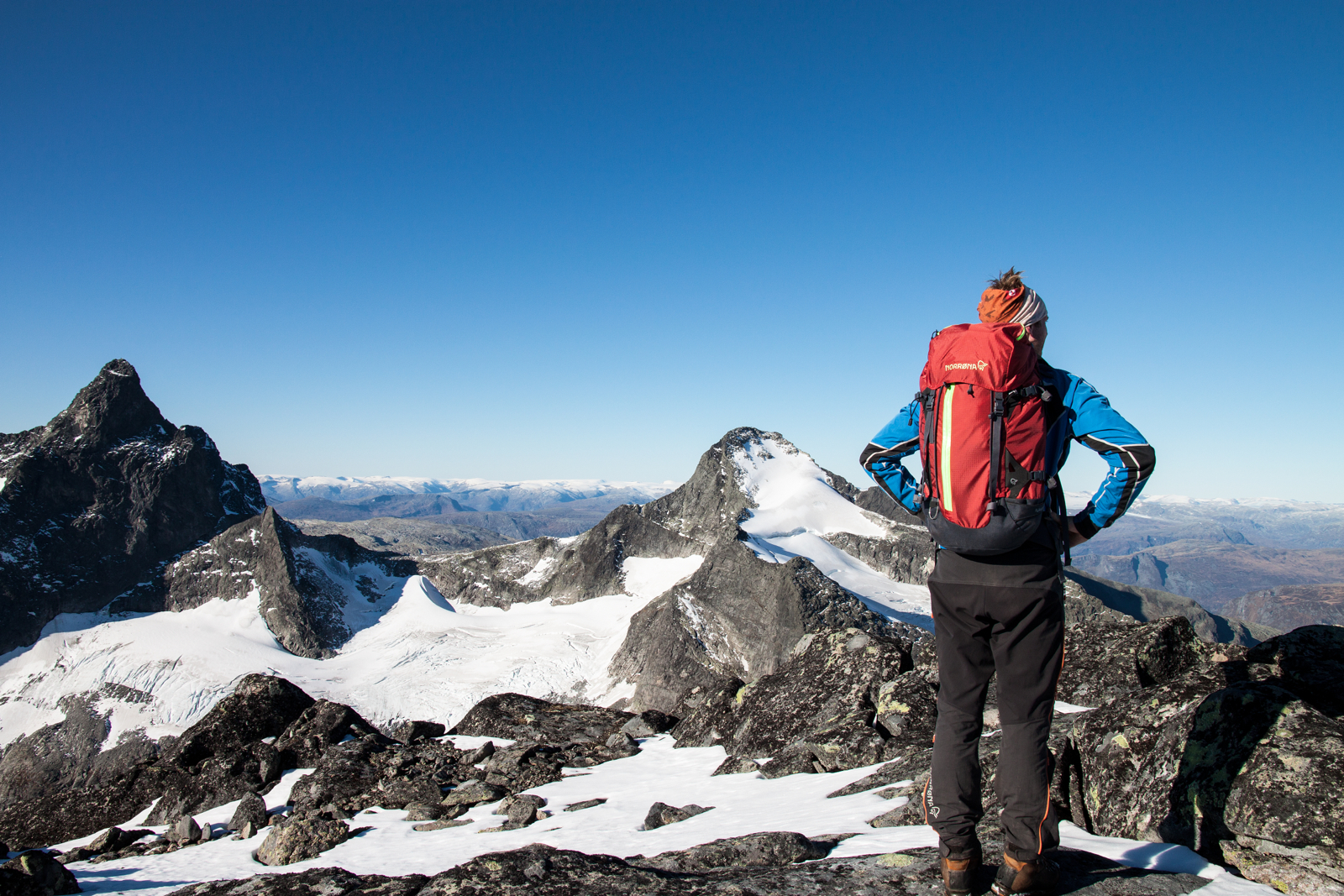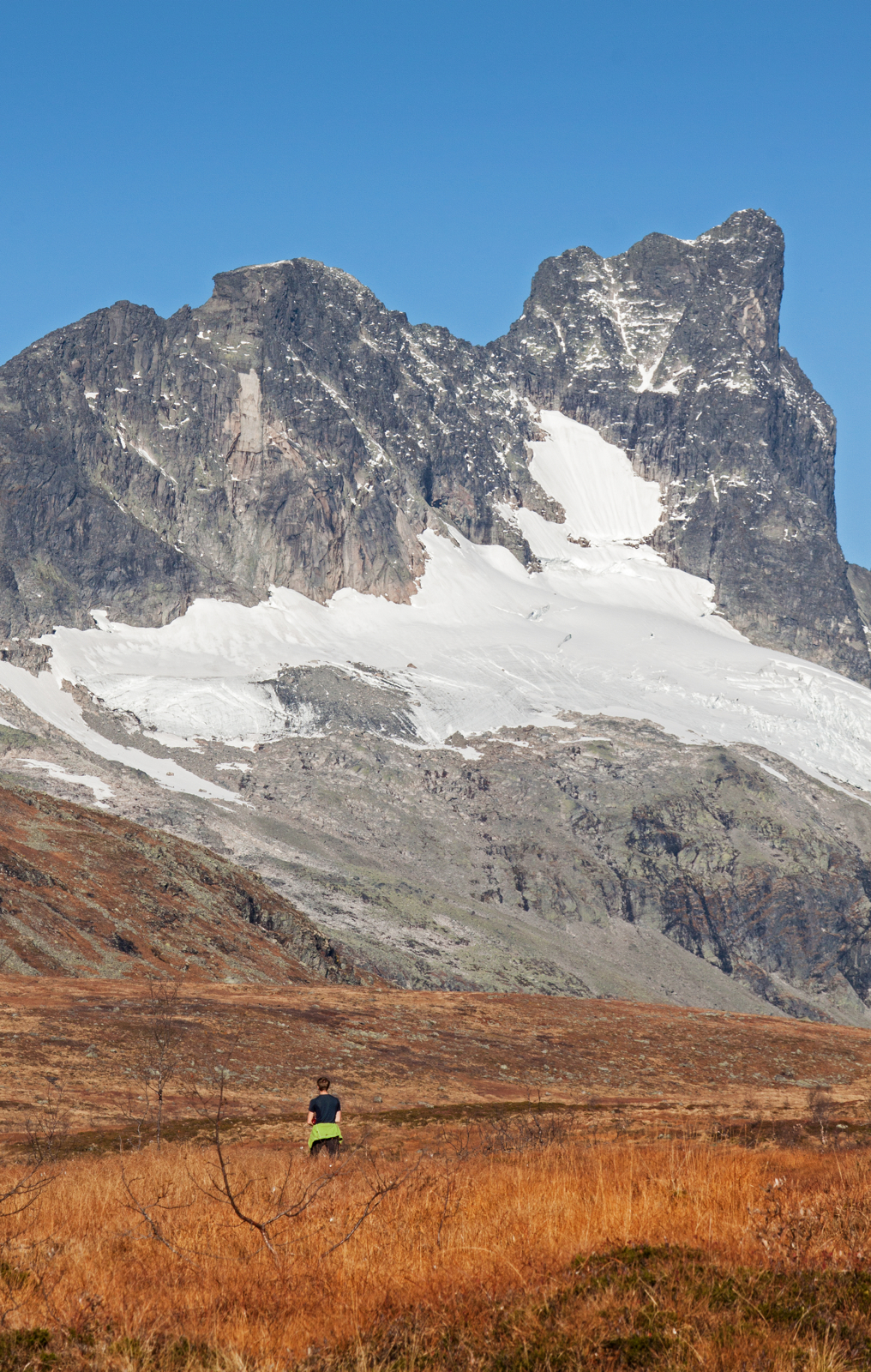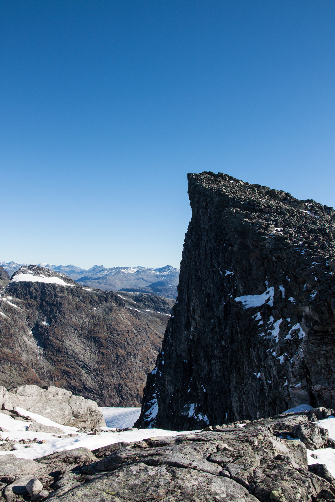 Etter å ha kosa oss med nista blir me ståande i snøkanten og skue utover i nokre stille sekund. Sjølvaste Storen lyser beint i mot oss, og i det klåre haustvêret ser me store delar av Jotunheimen. Det går ikkje lange tida før Memurutindane, Storebjørn og Uranostinden er peika ut i horisonten.