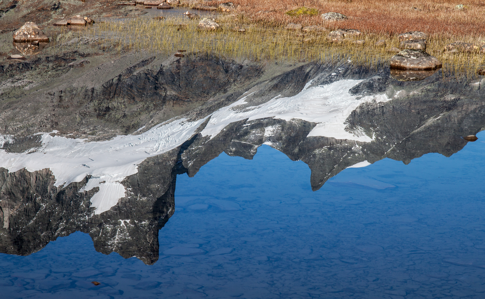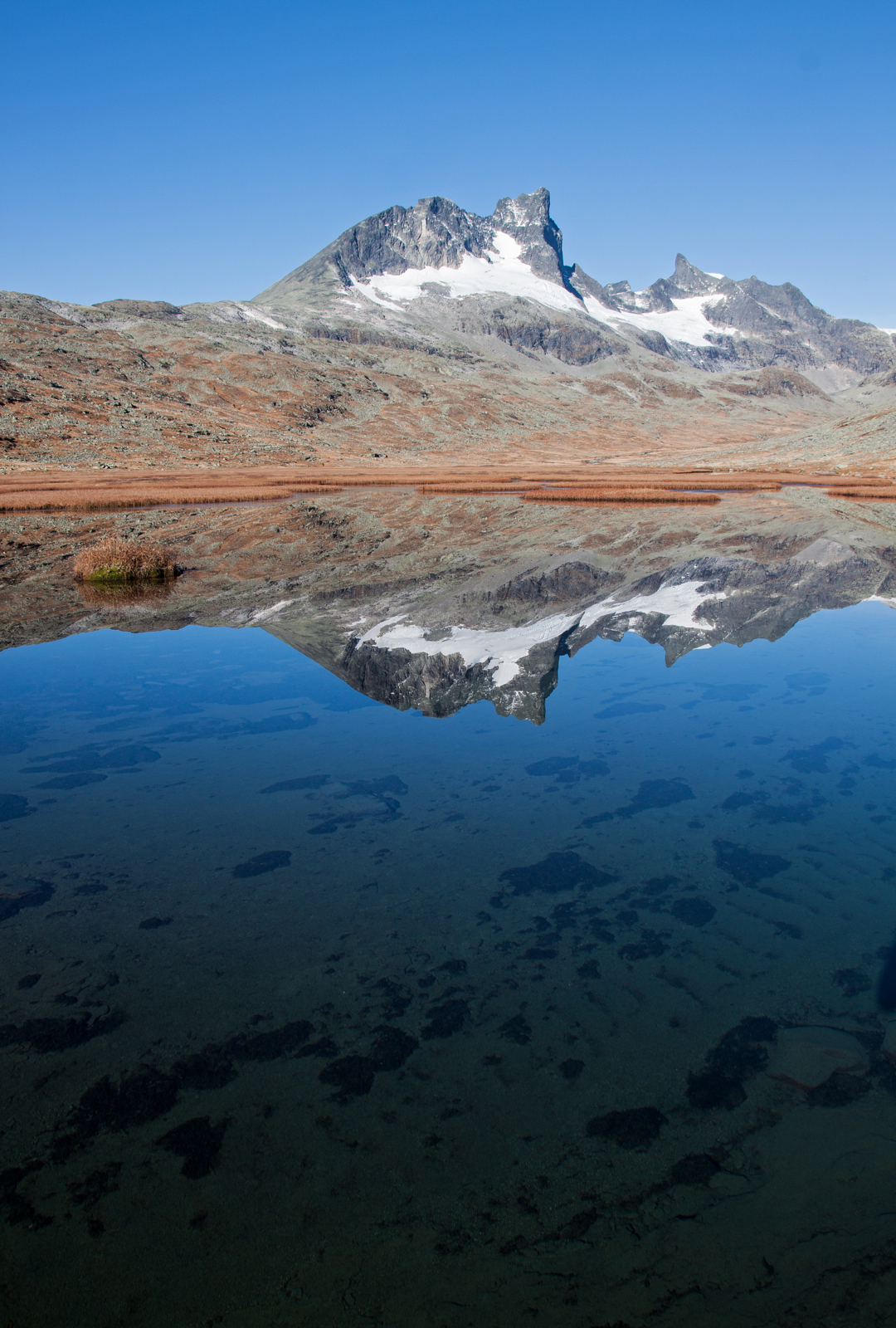 Det skal syne seg å vera eit godt val. Myrene er oppturka av den fine hausten, og nattefrosten bidreg også til at turen oppover dalen går som ein leik. I det me når fram til Gravdalsvatnet har heile panoramaet med Austabotntindane, Ringstindane og Stølsmaradalstinden openberra seg framfor oss. Vatnet ligg blikk stille, og sola varmar så godt at me kastar trøya båe to.