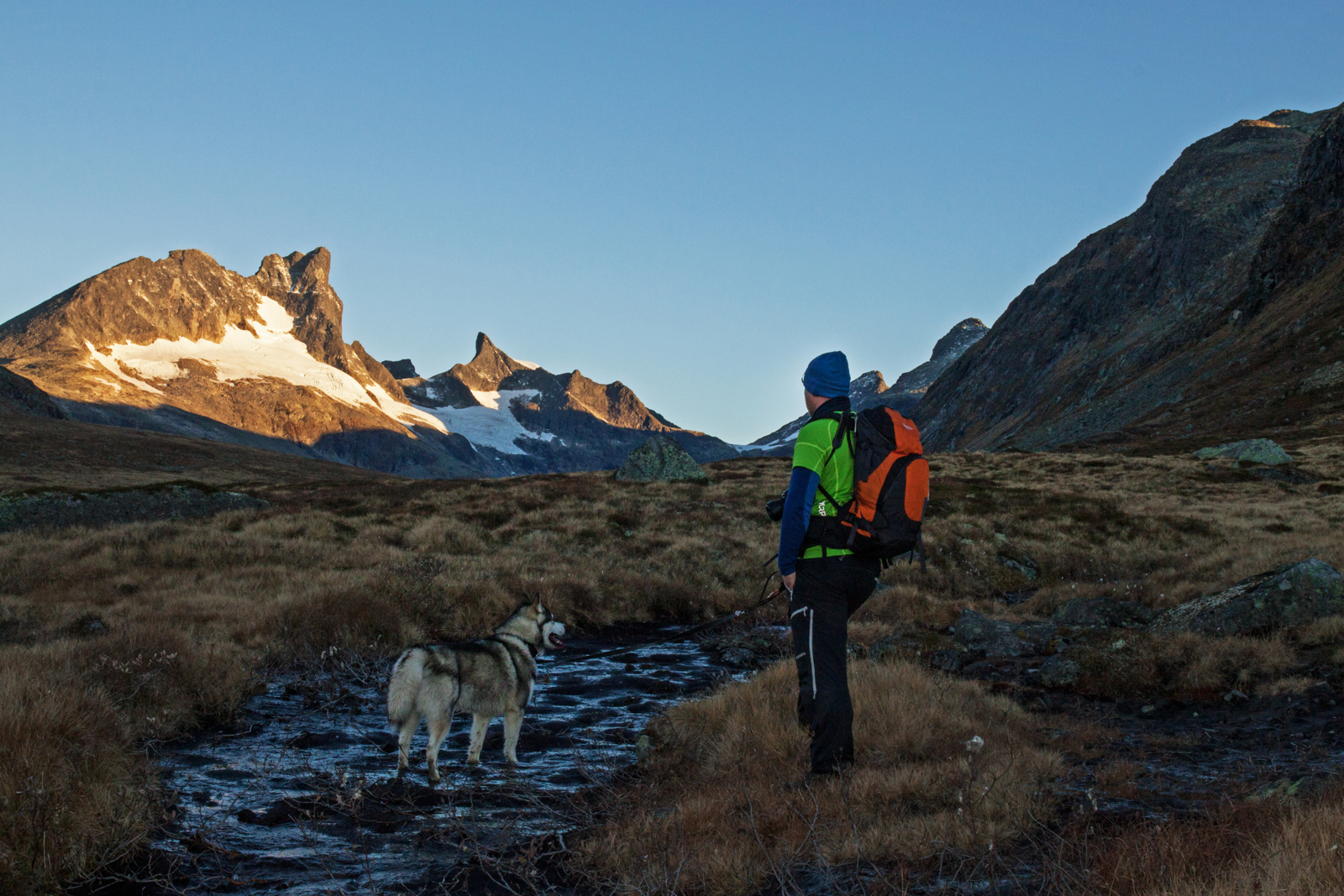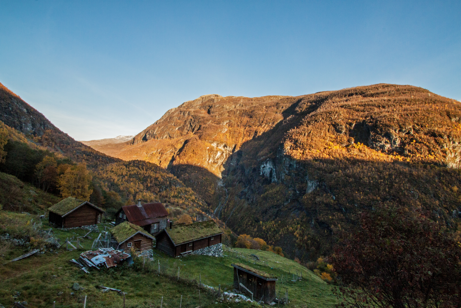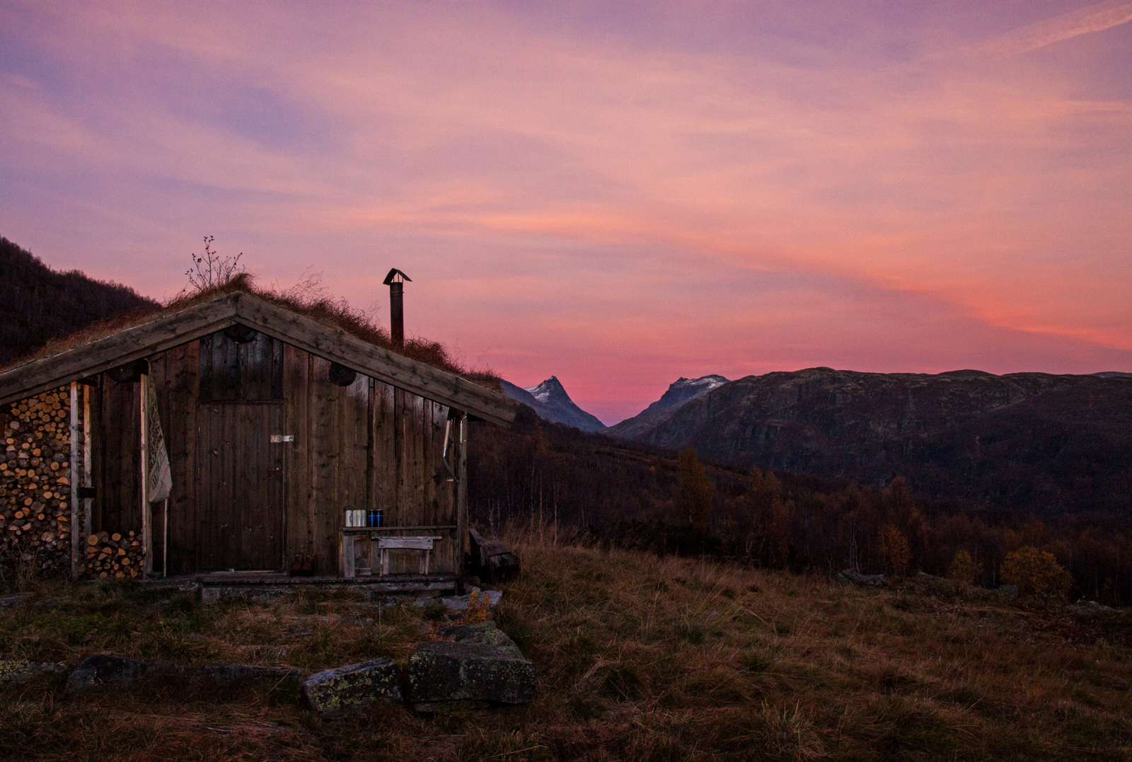 Me blir ståande i eit lite minutt berre for å nyte det heile. Tre sjarmerande hytter omkransa av nyrima gras og ei brusande elv, med eit panorama som kunne fått sjølv gamle Slingsby til å bli mo i knea. Rett framfor oss ruvar Austabotntindane i all si prakt, og austover ser me dei kjende profilane til Falketinden og Hjelledalstinden. Alt er fargelagt av dei siste restene av solnedgangen, med fargar som ein kun ser så seint på hausten.