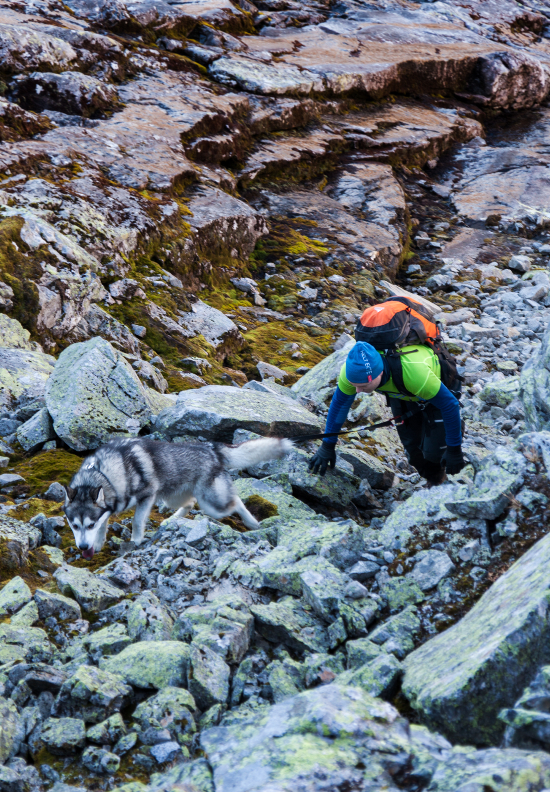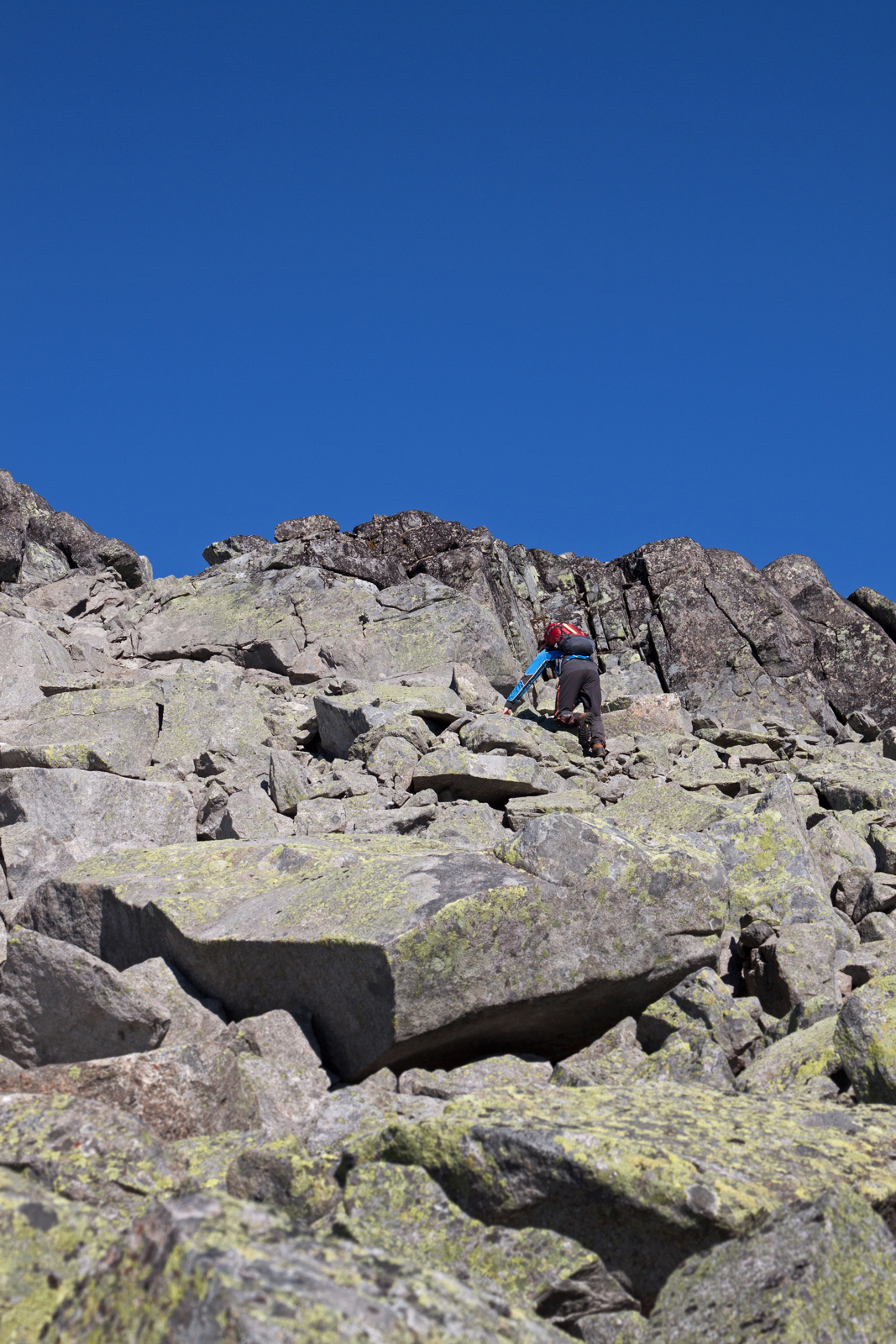 Springing blir det lite av i steinrøysa, men turen til toppen går tåleleg greitt likevel. I følge turrapportane me hadde funne på nettet var dette ein lite besøkt topp på sumarstid, noko også vardinga (eller mangelen på varding) ber preg av. Men sume stader står det små vardar, og med skarpt blikk klyv me oss sakte men sikkert til topps.
