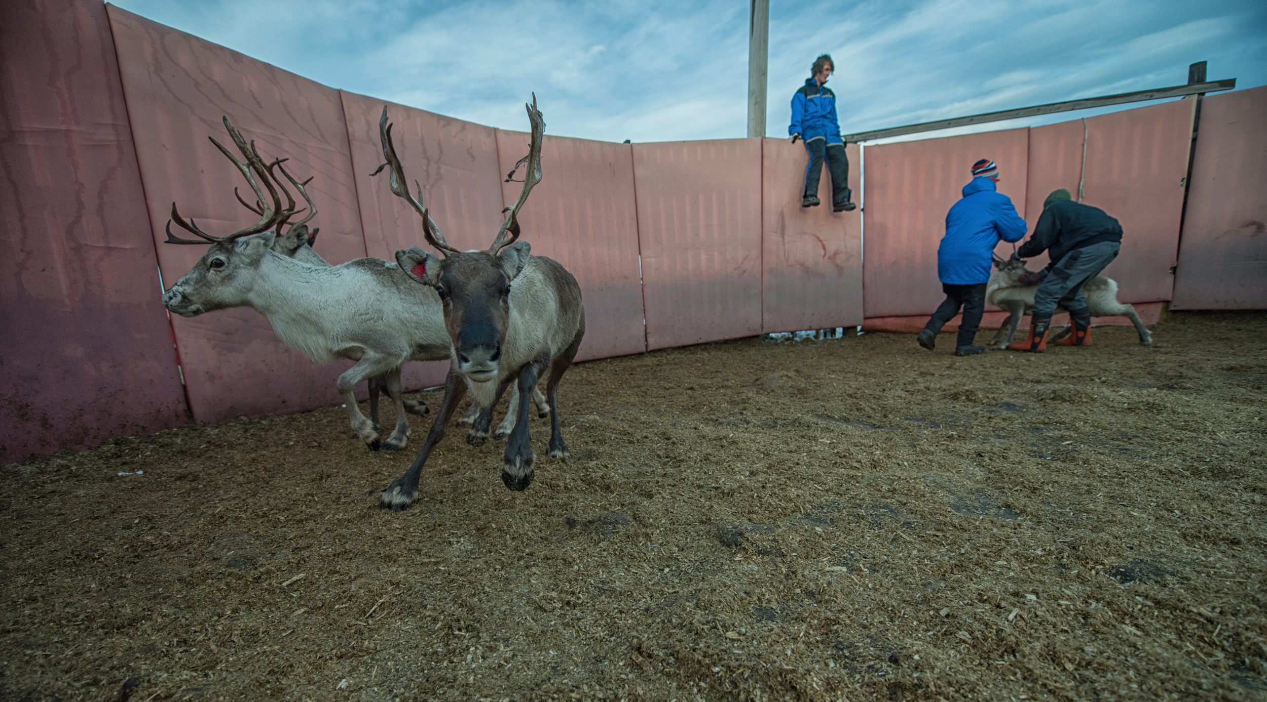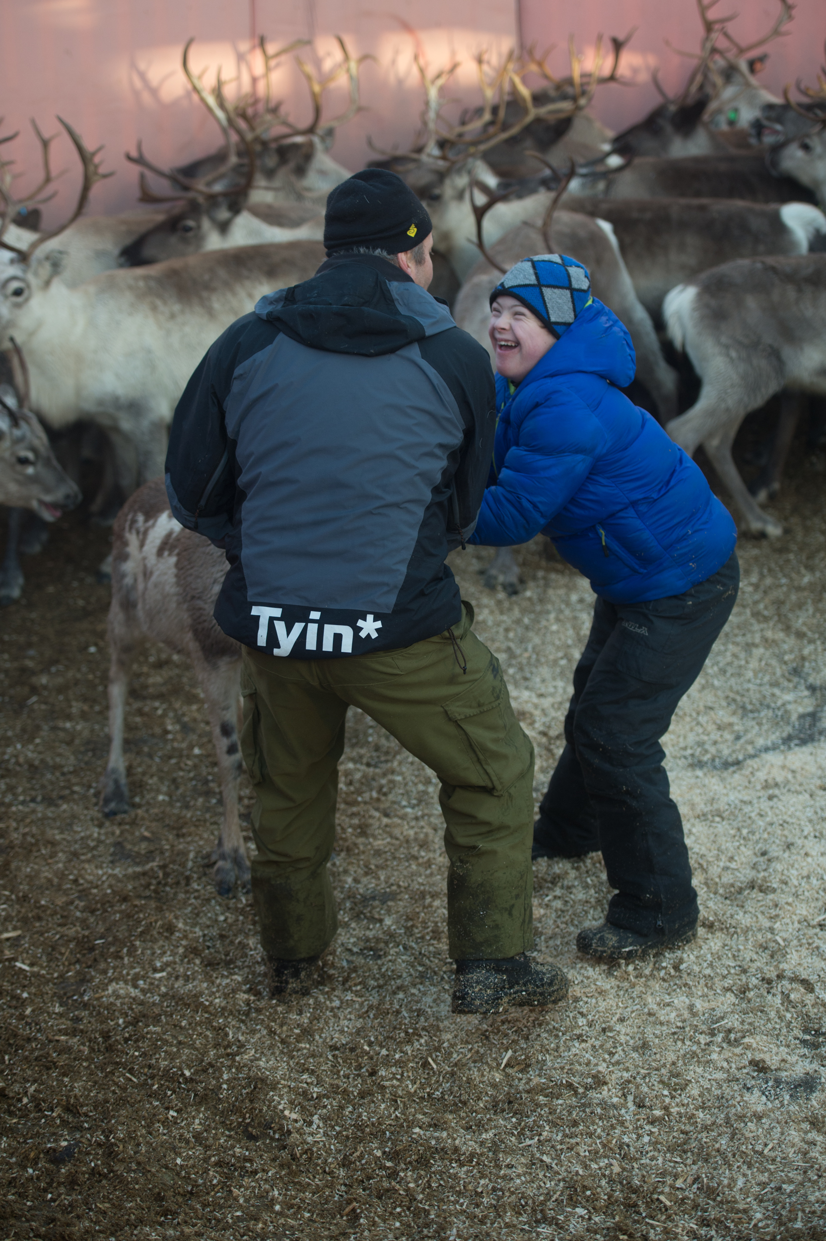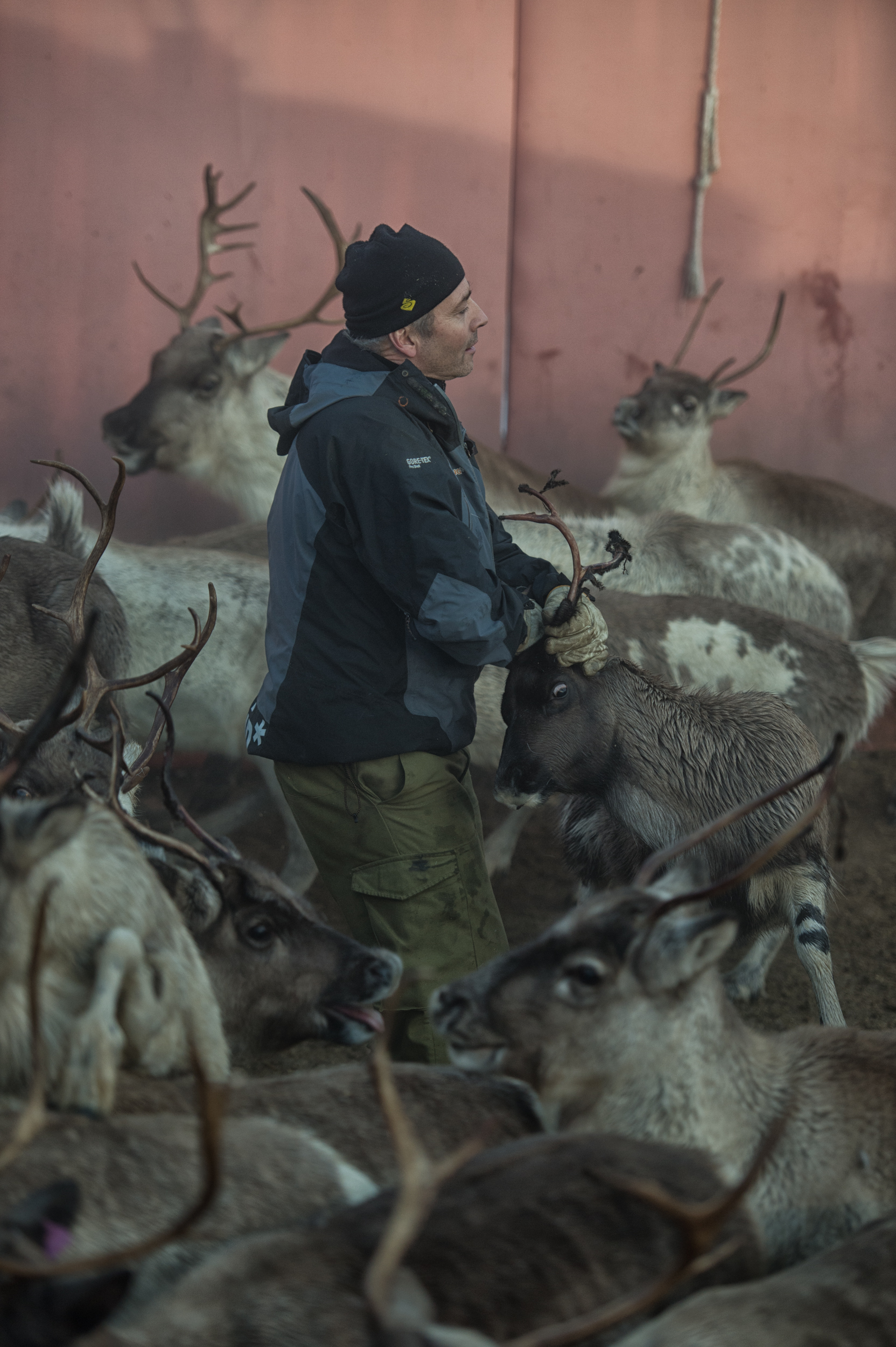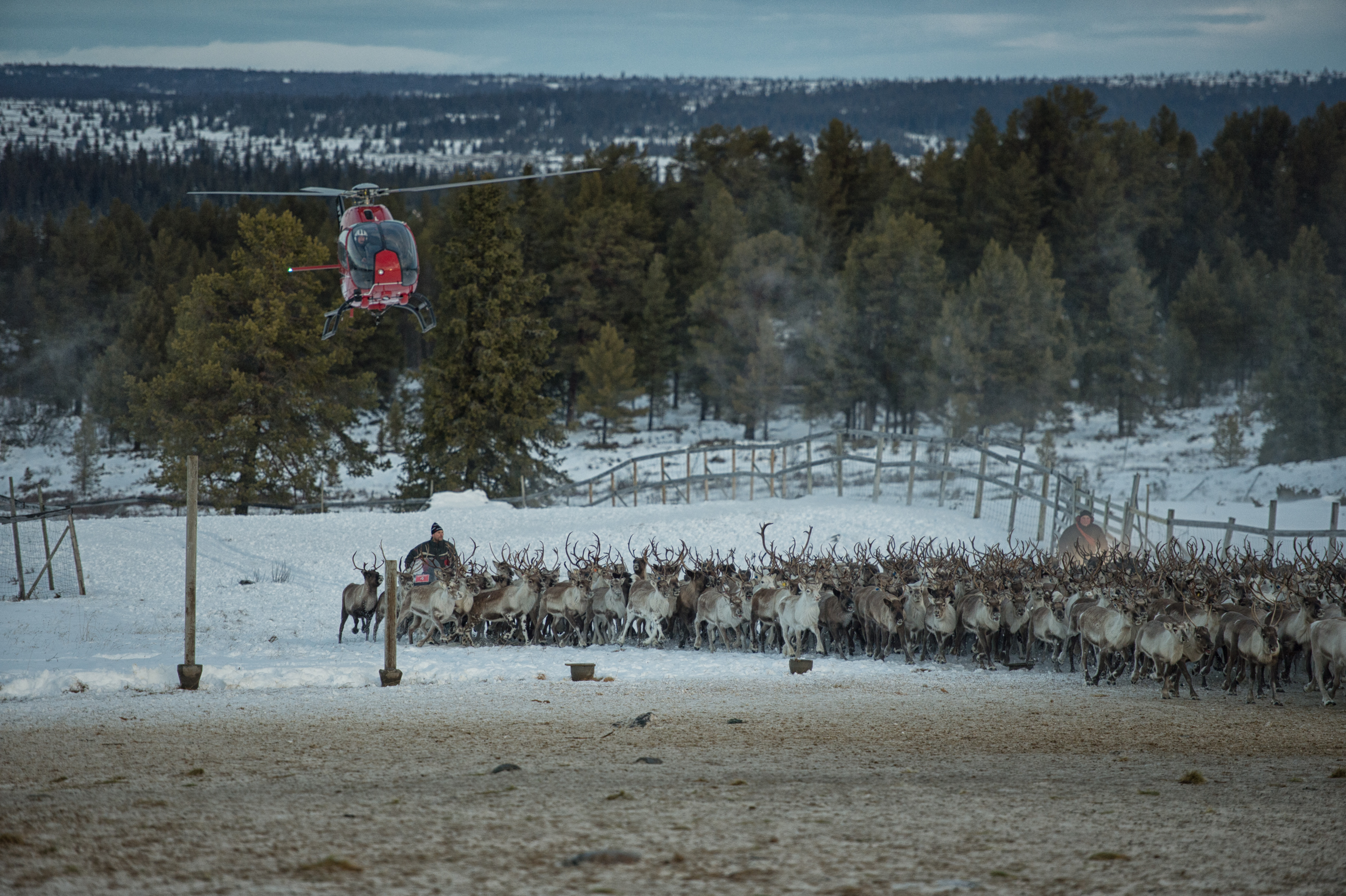 Noen er litt skeptiske, forståelig nok. Det går fort, reinsdyra løper i ring. Pruster, stresser. Men alle tar sin tørn med både å sortere og veie dyra. Mange minutters intensiv jobbing, deretter noen minutters hvile før helikopteret starter opp igjen.