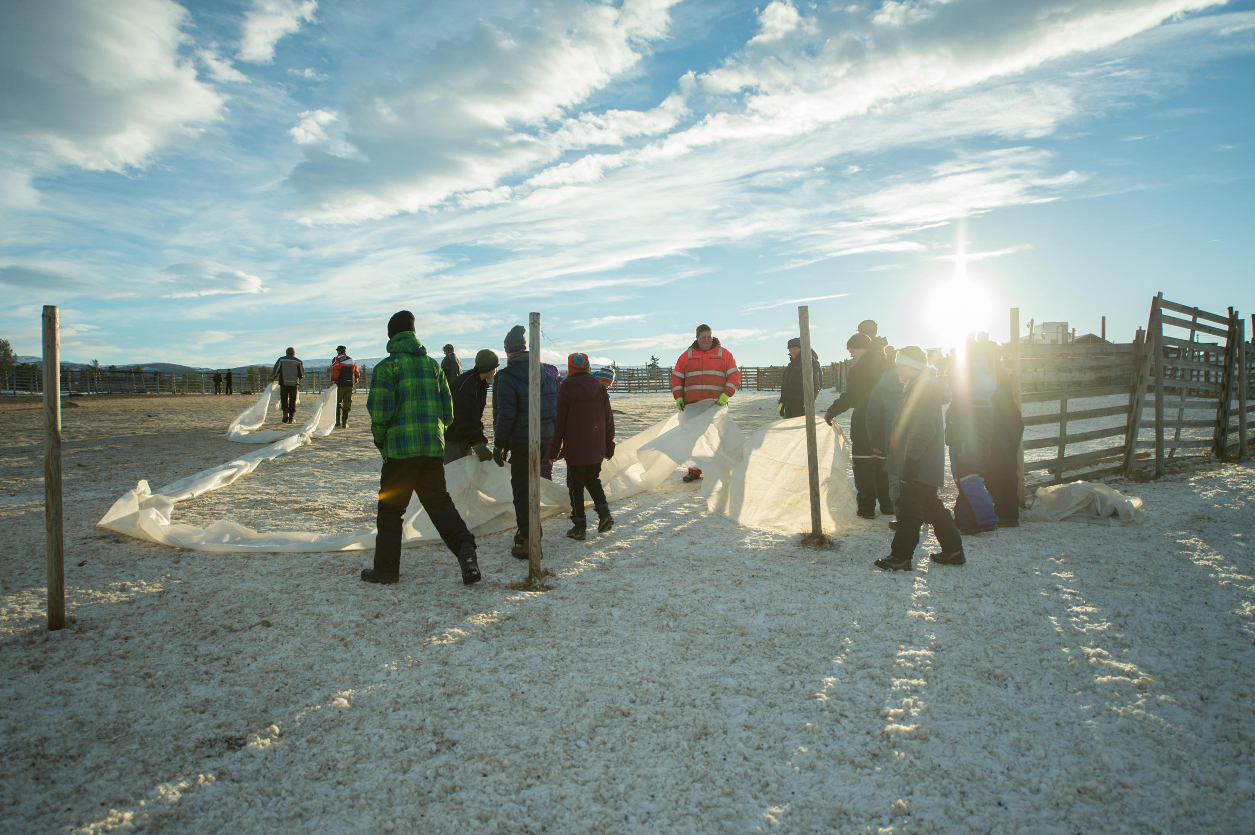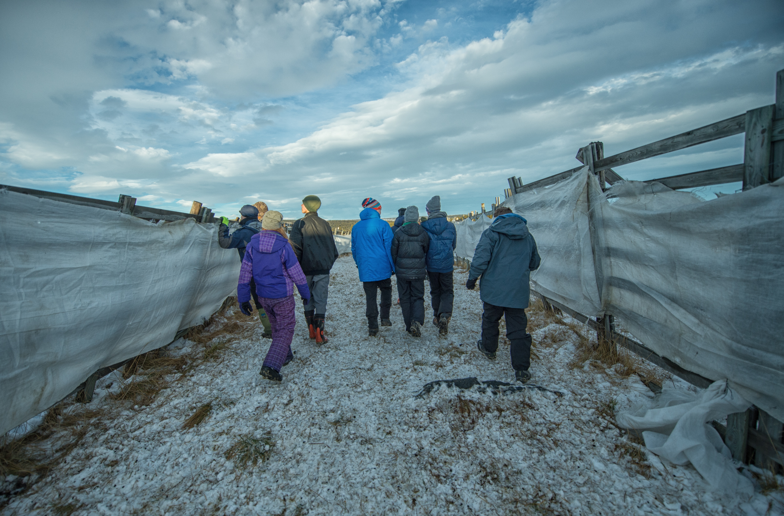 Nye deler av flokken skal drives inn fra hamnehagen til kveet. På grunn av lite snøi fjellet og generelt mye dårlig vær har det vært vanskelig å bruke snøskuter til å drive inn flokken fra sommerbeite i Hemsedal og nordover mot Filefjell.